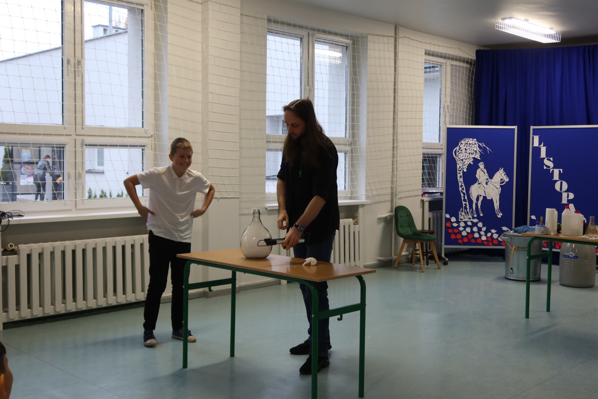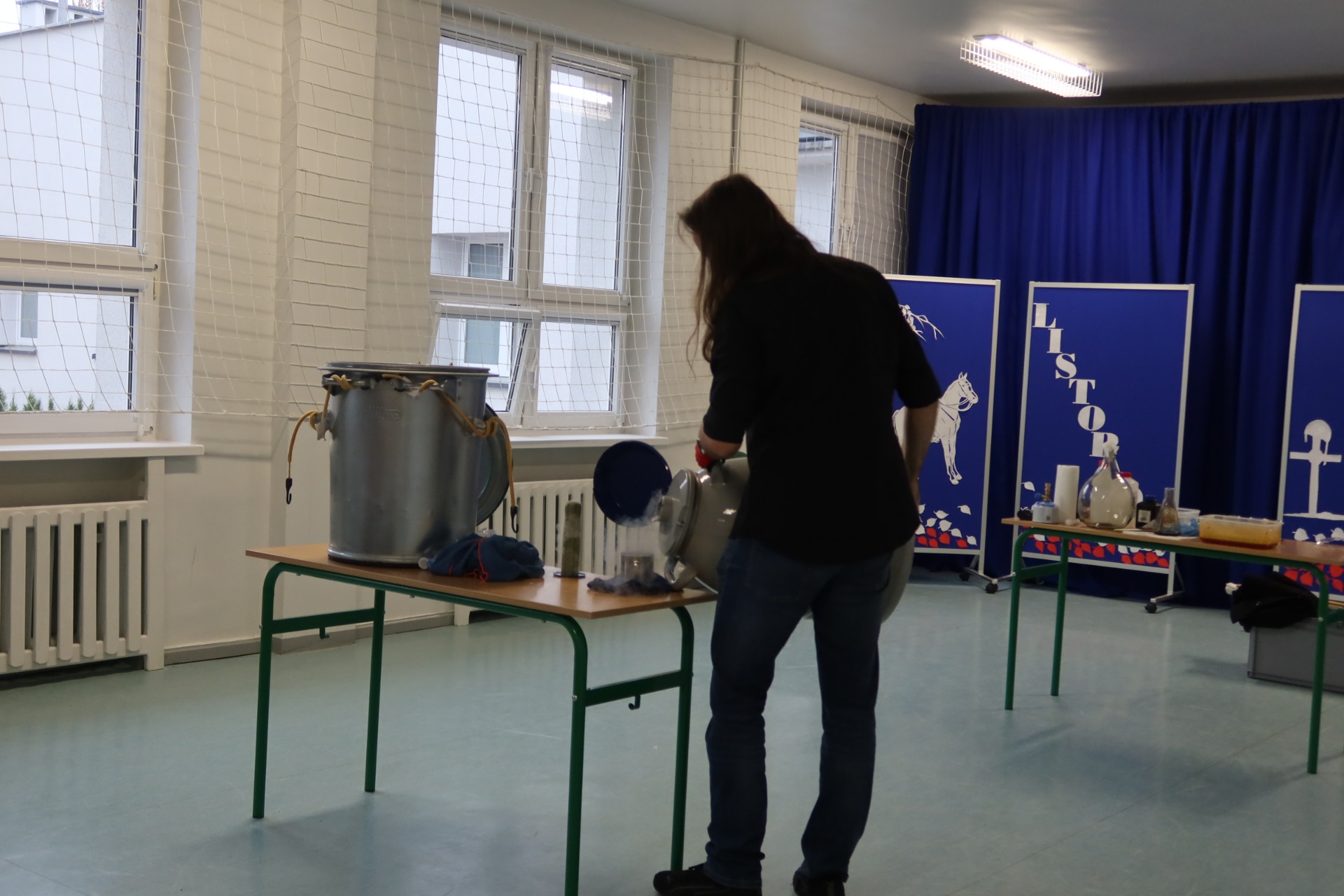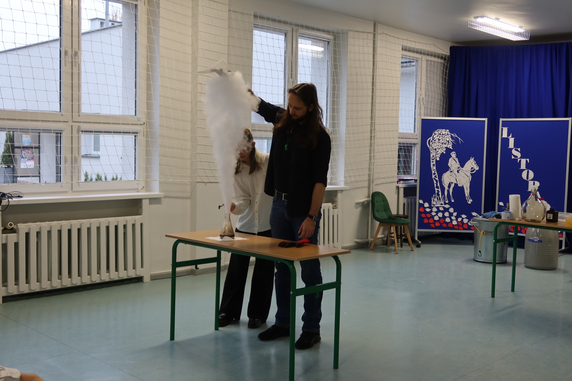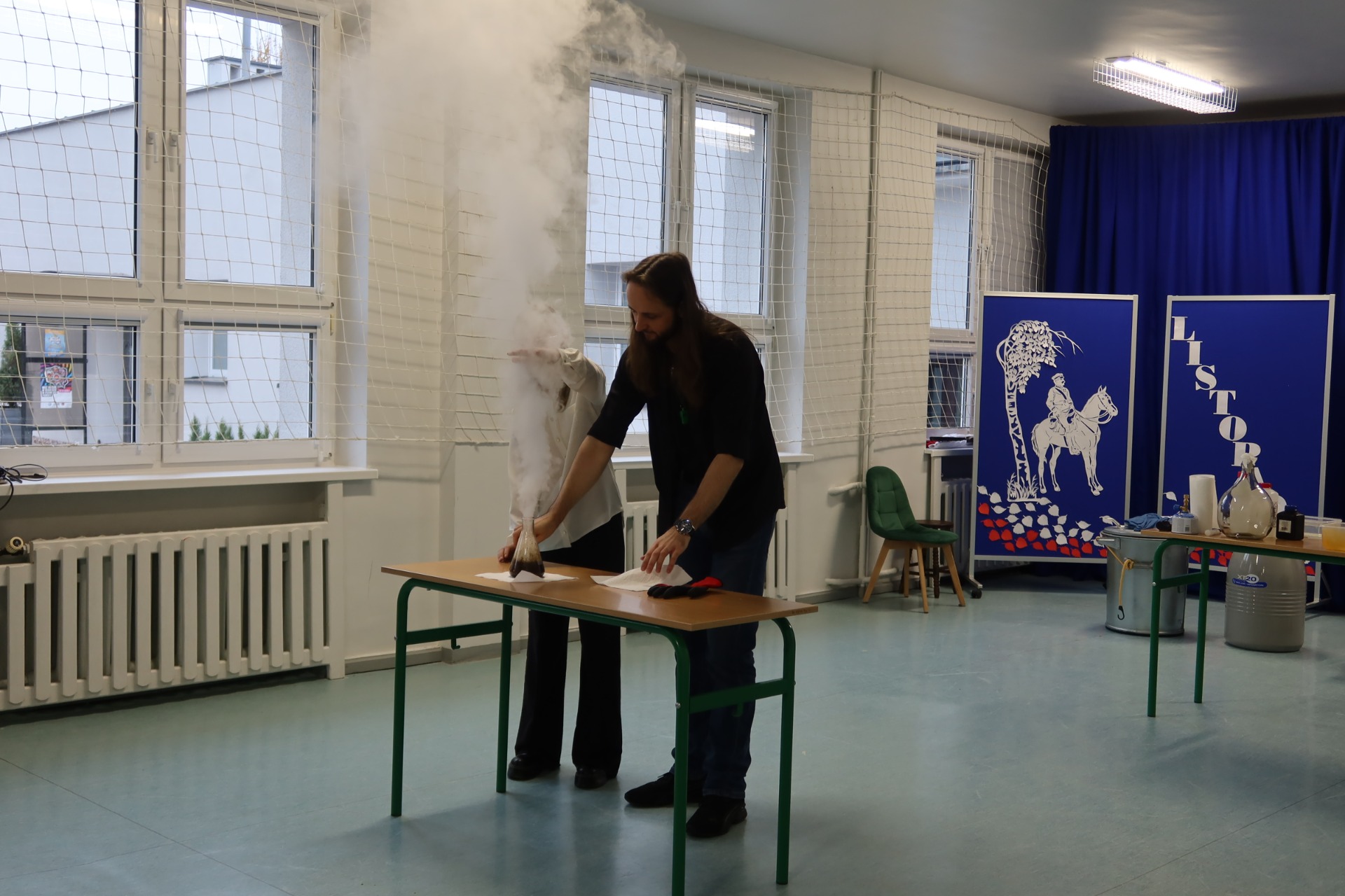 W dniu dzisiejszym uczniowie z kl. 4-8 brali udział w nietypowej lekcji przyrody w trakcie której dowiedzieli się m.in. w jaki sposób stworzyć własną chmurę, czym jest efekt krwawiącej ręki, jakie możliwości daje nam ciekły azot i wiele innych ciekawych informacji.