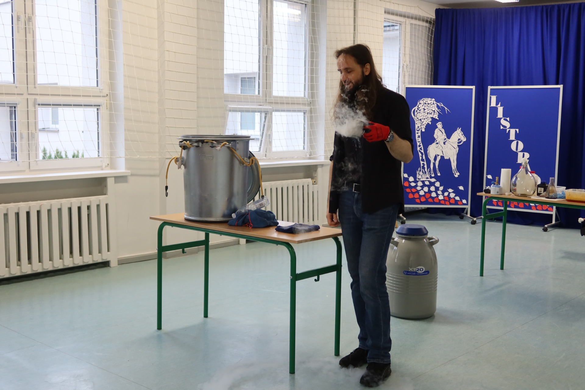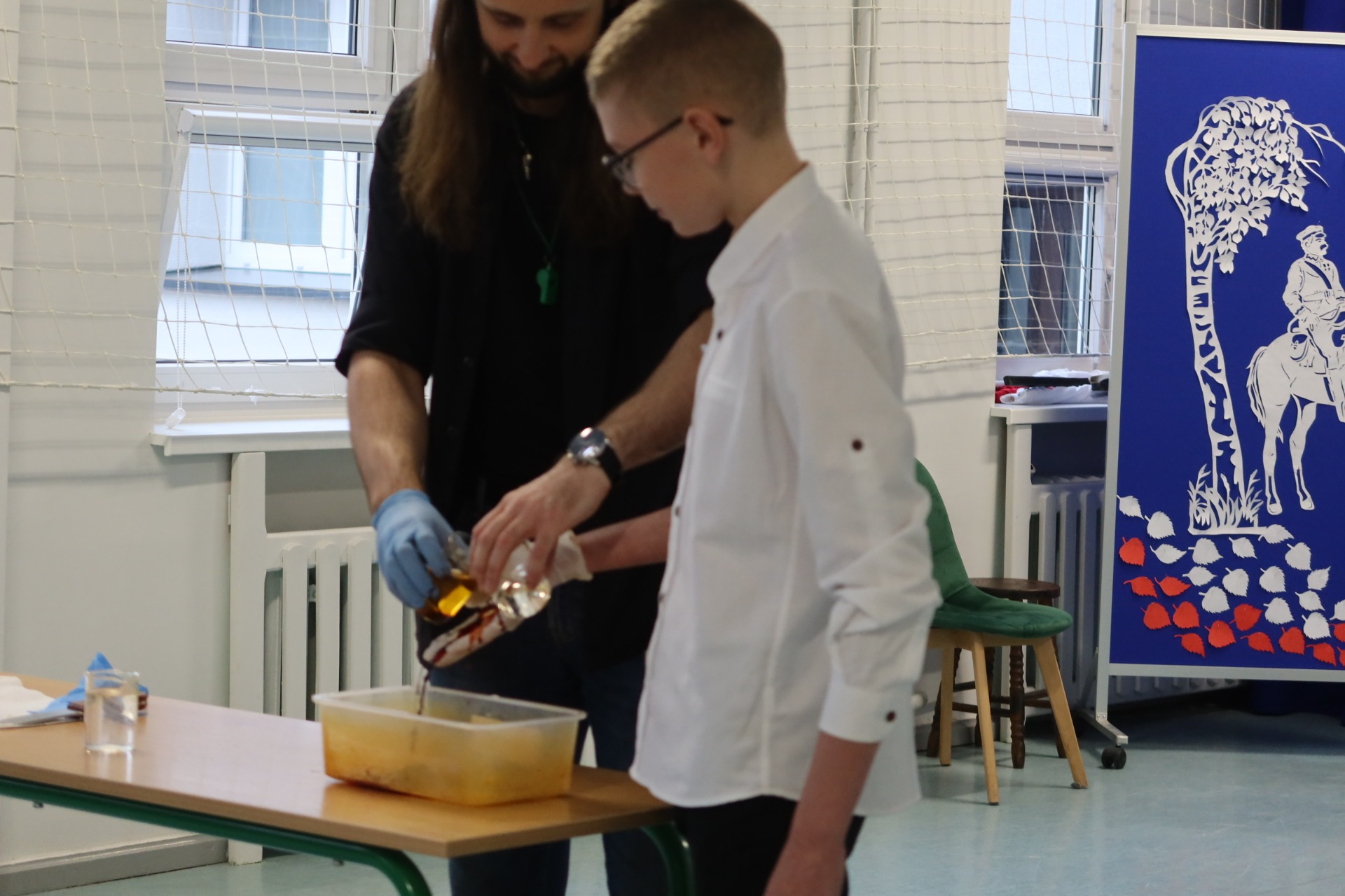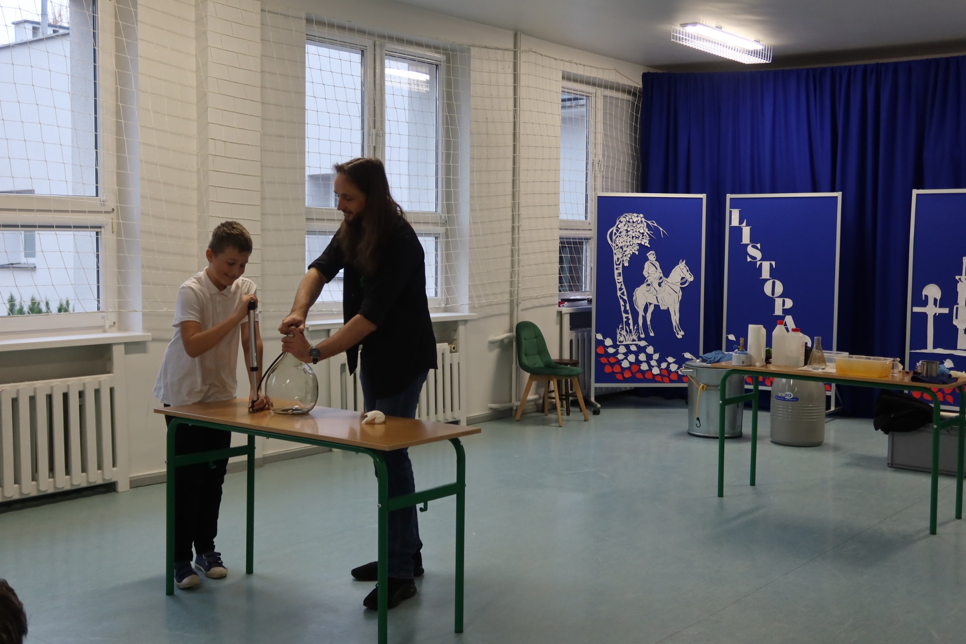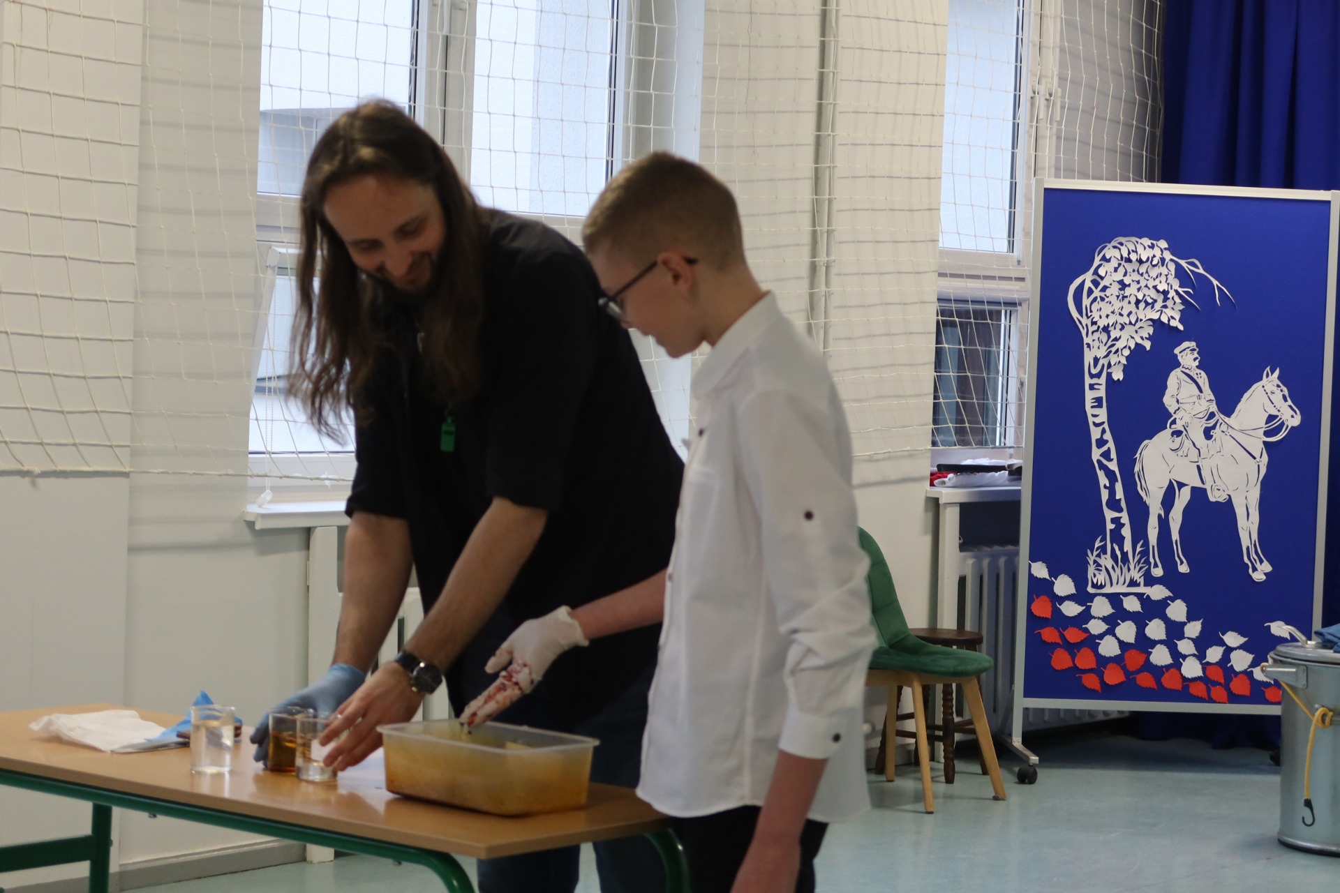 W dniu dzisiejszym uczniowie z kl. 4-8 brali udział w nietypowej lekcji przyrody w trakcie której dowiedzieli się m.in. w jaki sposób stworzyć własną chmurę, czym jest efekt krwawiącej ręki, jakie możliwości daje nam ciekły azot i wiele innych ciekawych informacji.