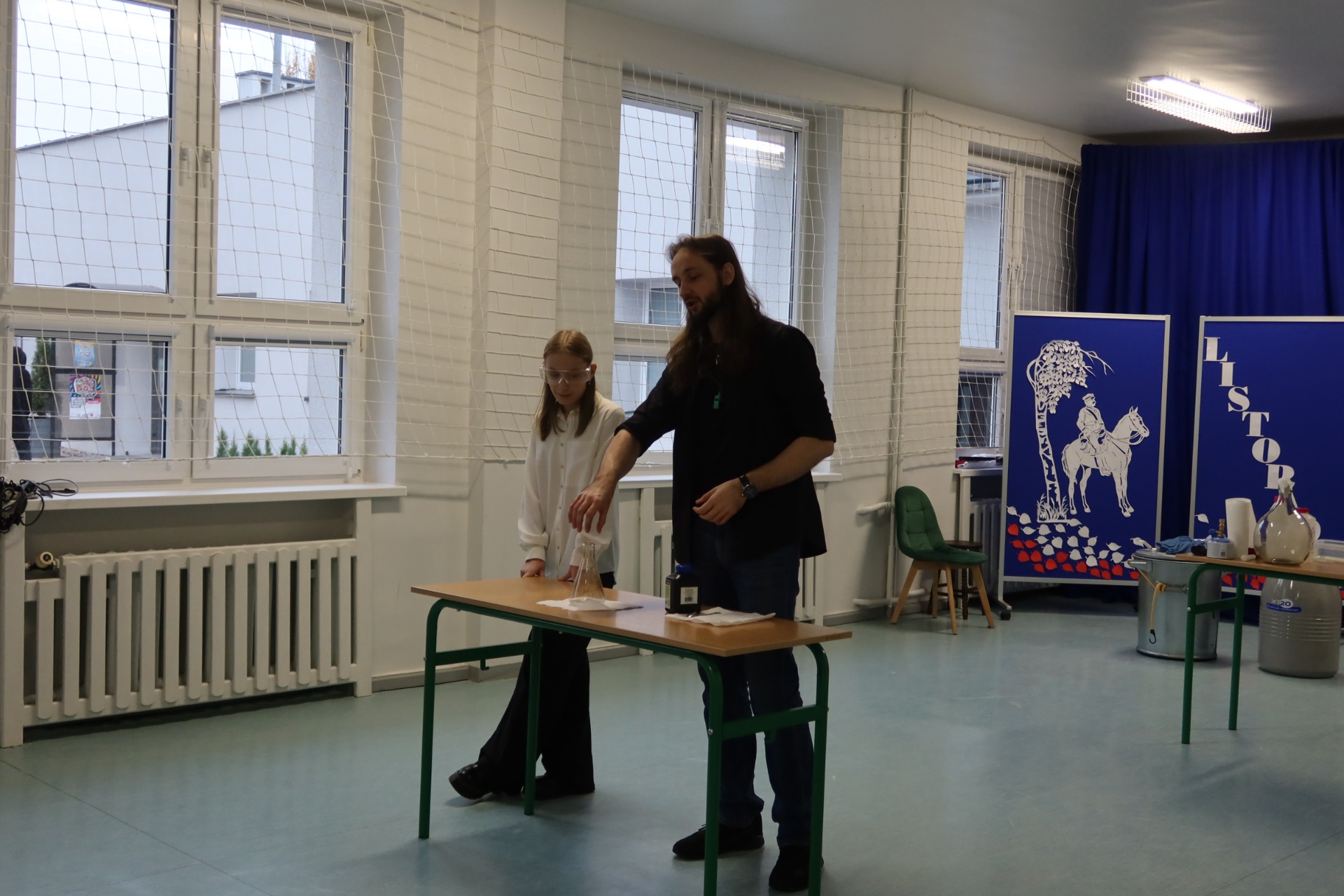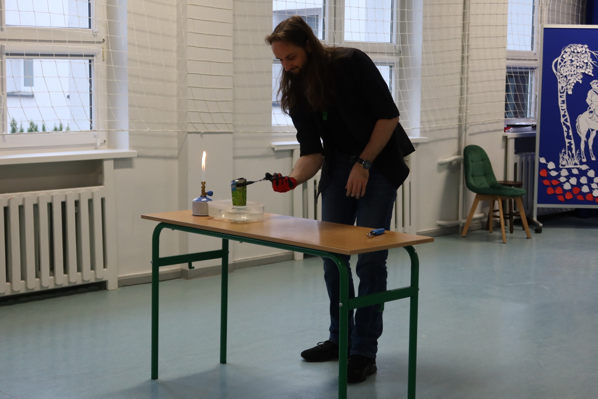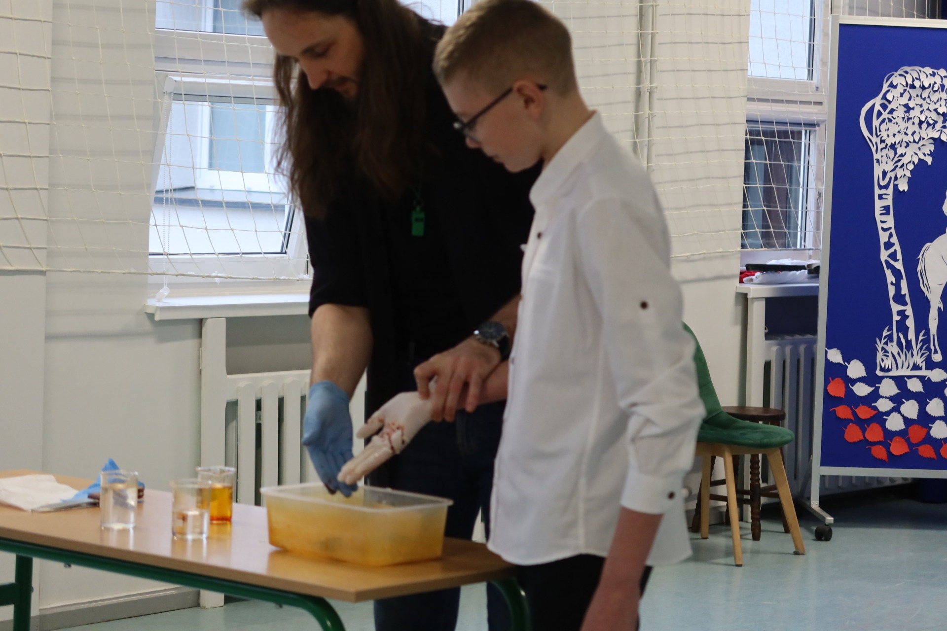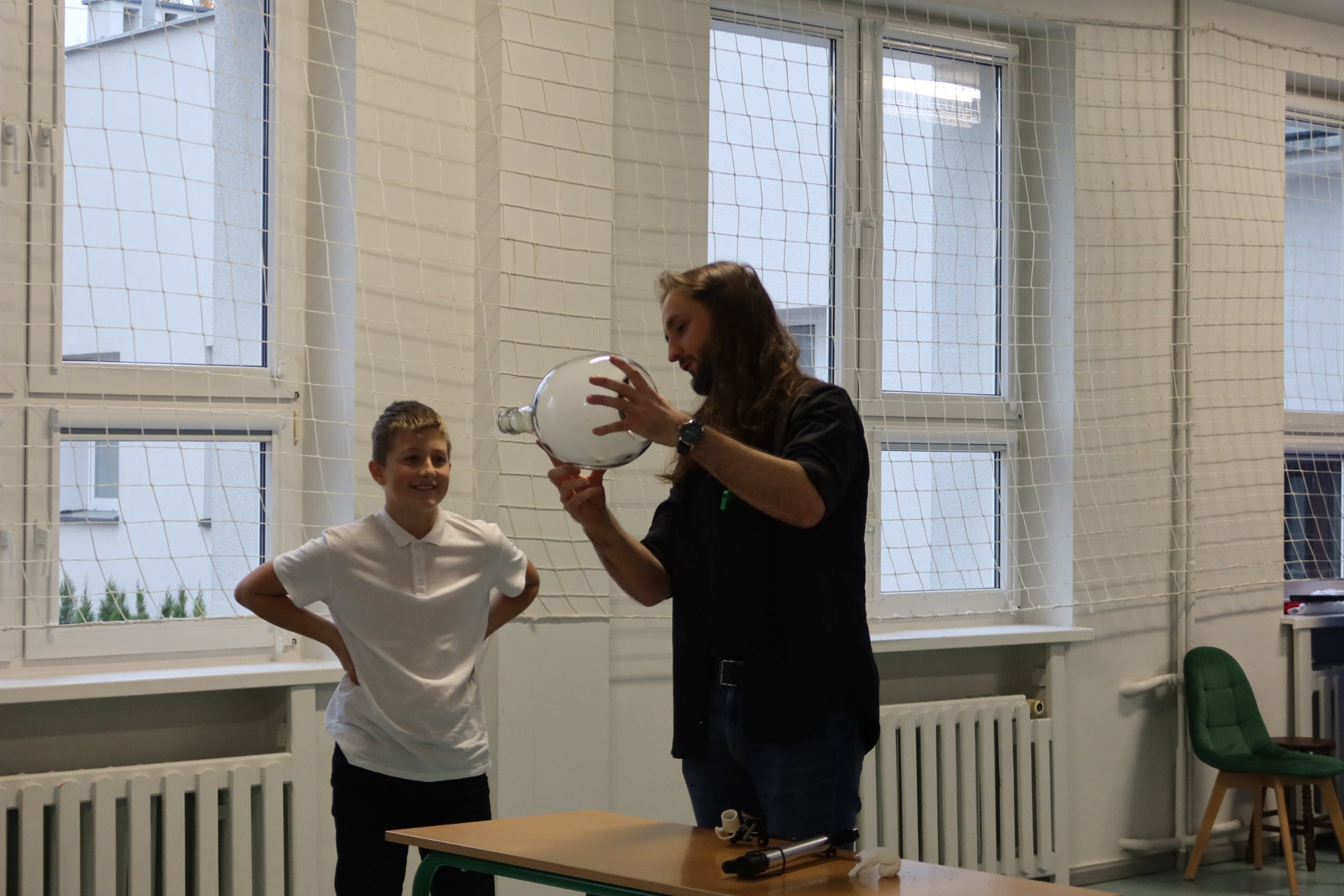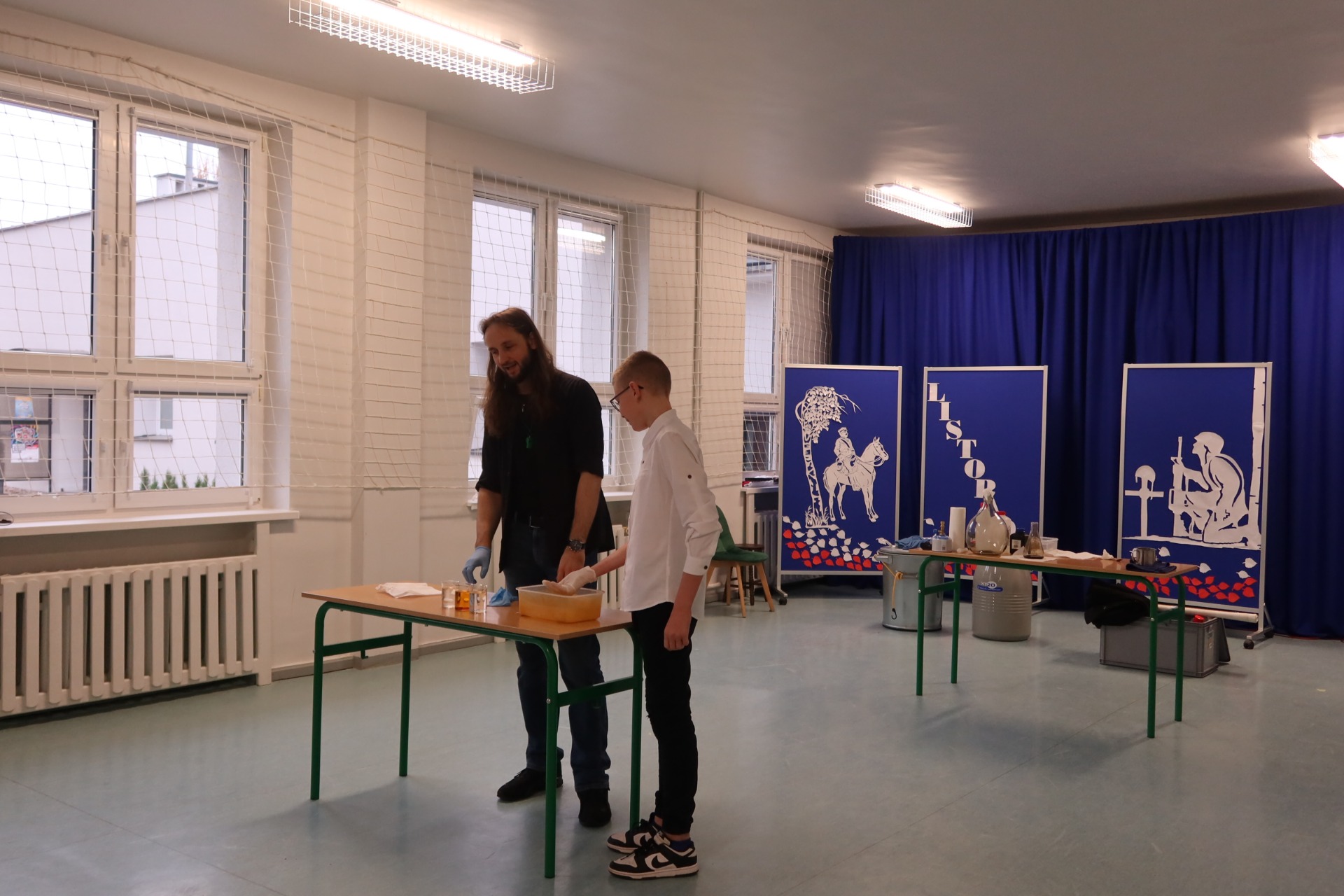 W dniu dzisiejszym uczniowie z kl. 4-8 brali udział w nietypowej lekcji przyrody w trakcie której dowiedzieli się m.in. w jaki sposób stworzyć własną chmurę, czym jest efekt krwawiącej ręki, jakie możliwości daje nam ciekły azot i wiele innych ciekawych informacji.