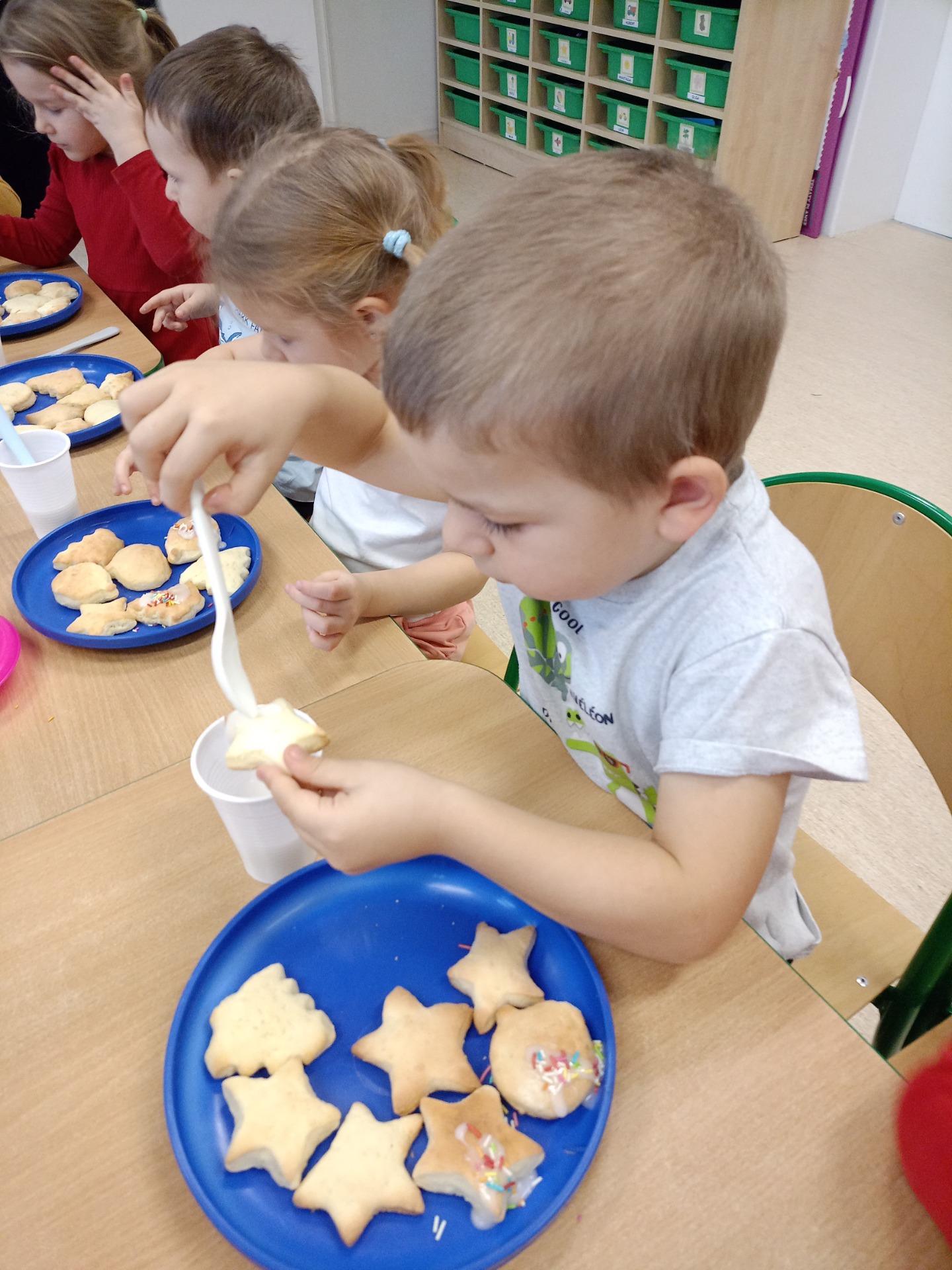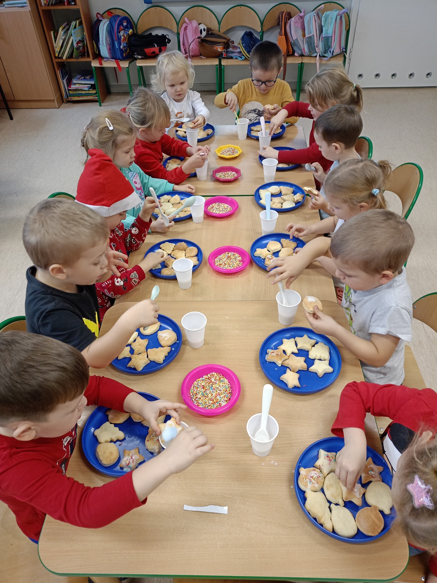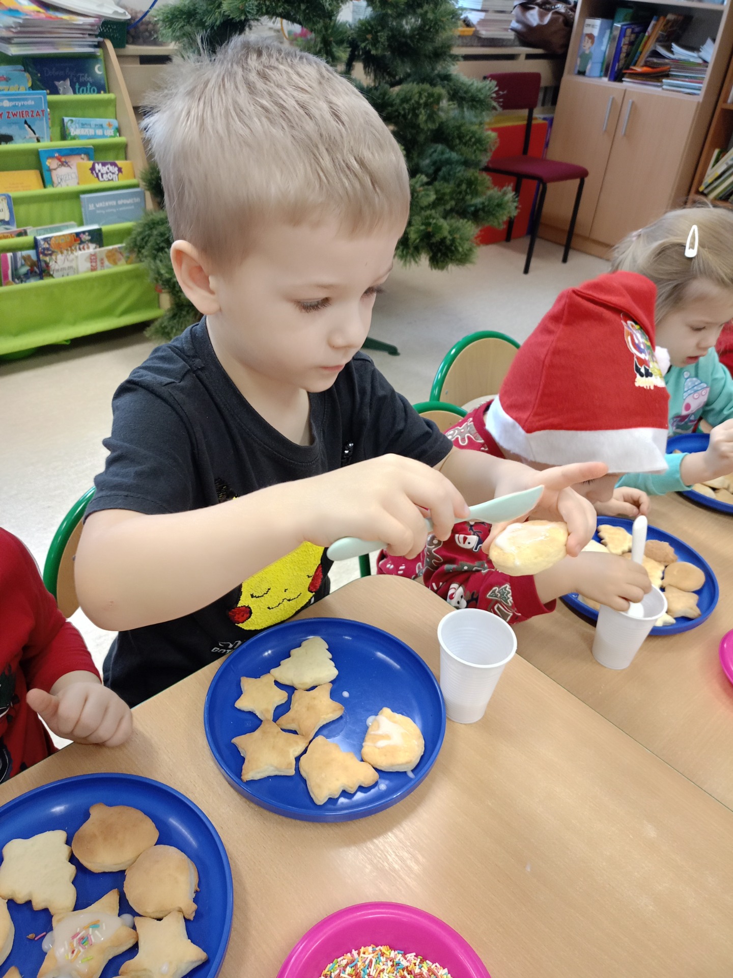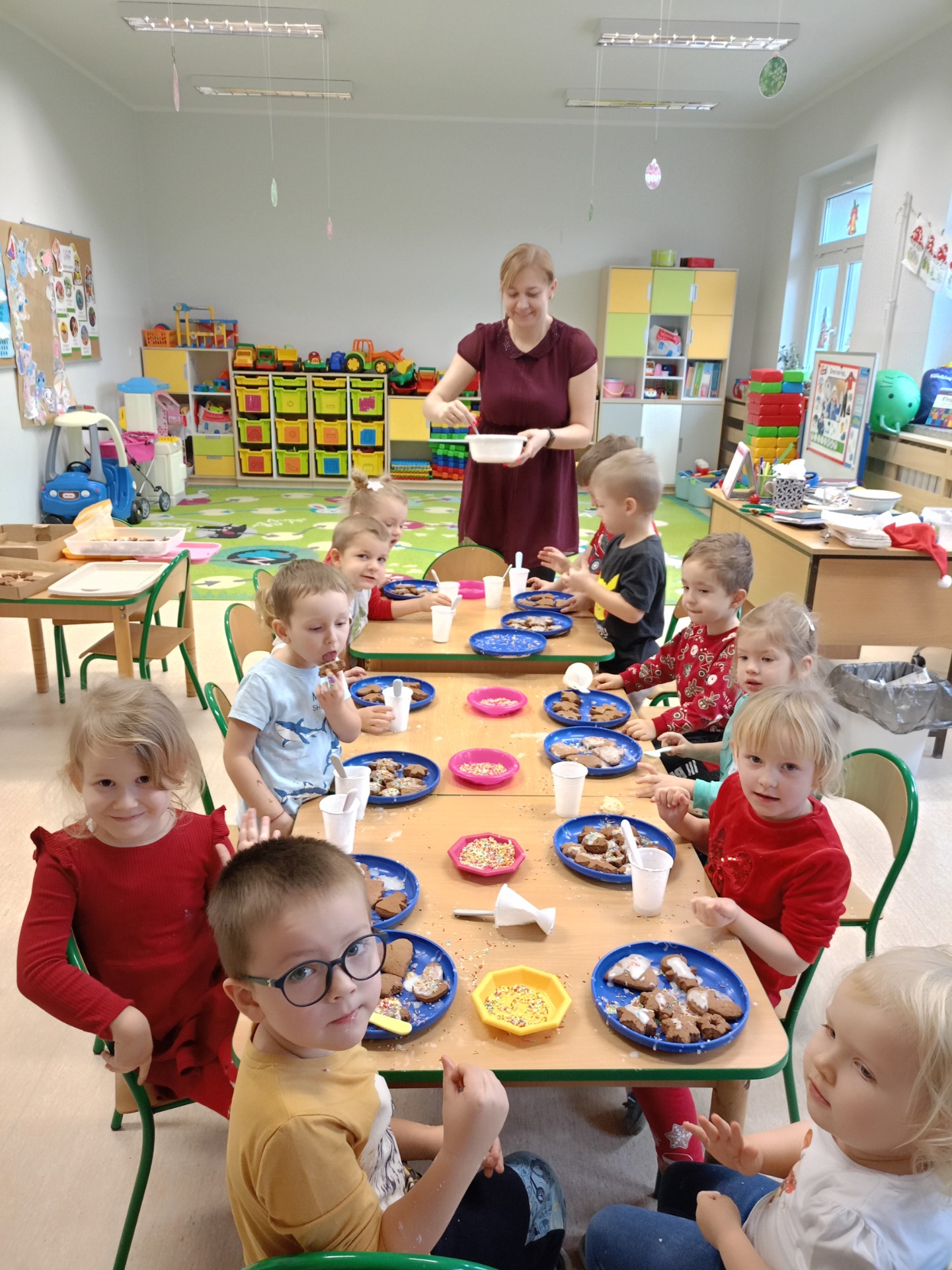 Dziś dzieci lukrowały świąteczne ciasteczka: pierniki i kruche ciasteczka. To doświadczenie przyniosło im wiele radości, a skupienie i koncentracja na zadaniu były godne podziwu, co oddają załączone zdjęcia. Dzieci ozdobiły pokaźną ilość ciasteczek, które miały okazję spróbować, symbolicznie zabrać do domu. Pierniczkami będą częstowanie jeszcze kilkukrotnie do świąt, a część została przekazana na Jarmark Bożonarodzeniowy w Goluchowie.
