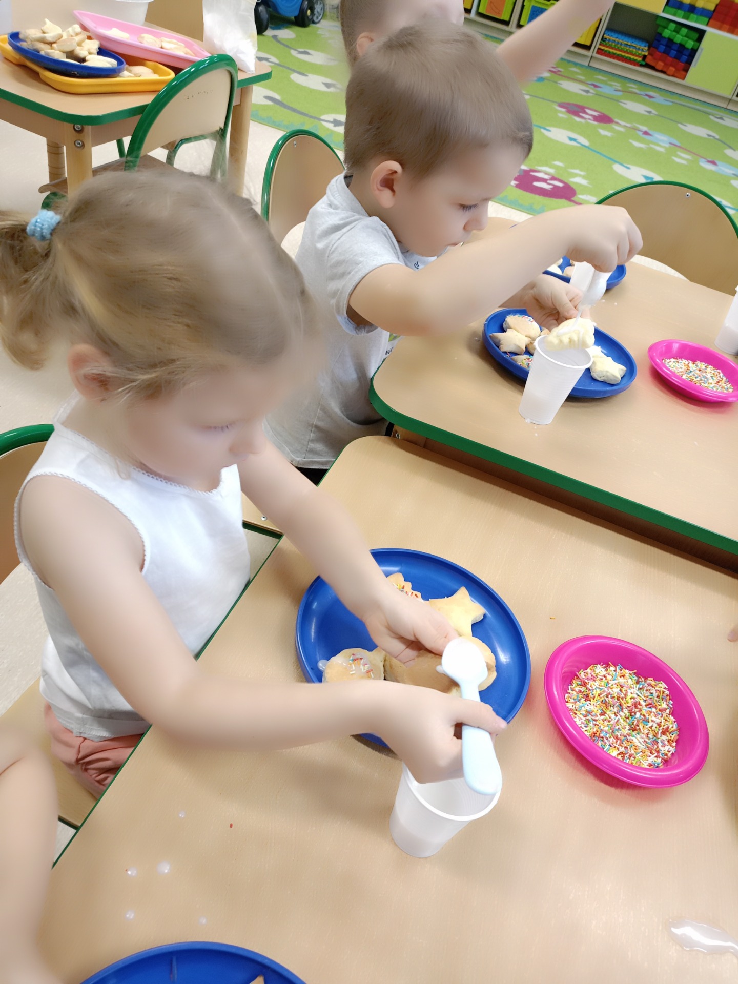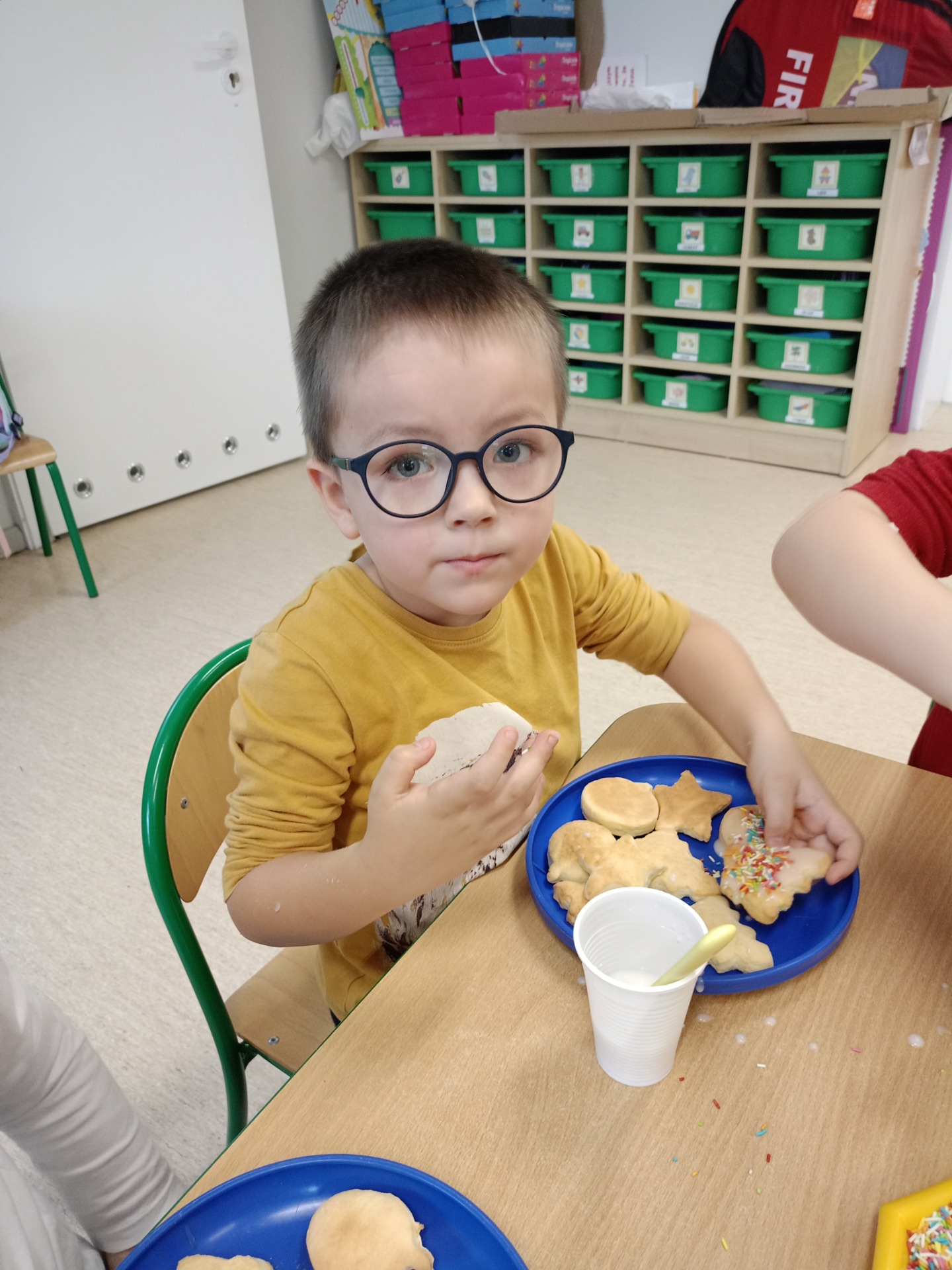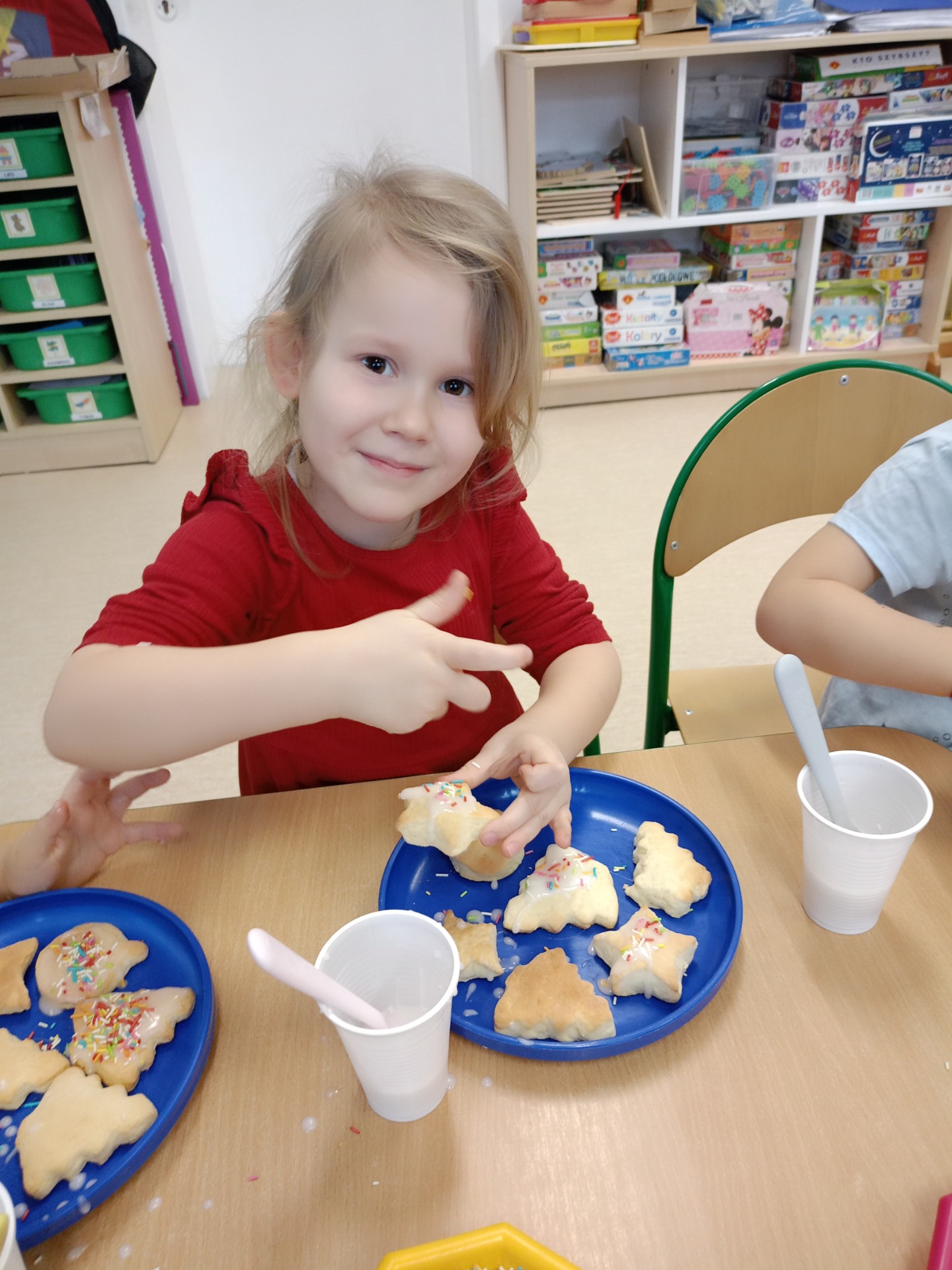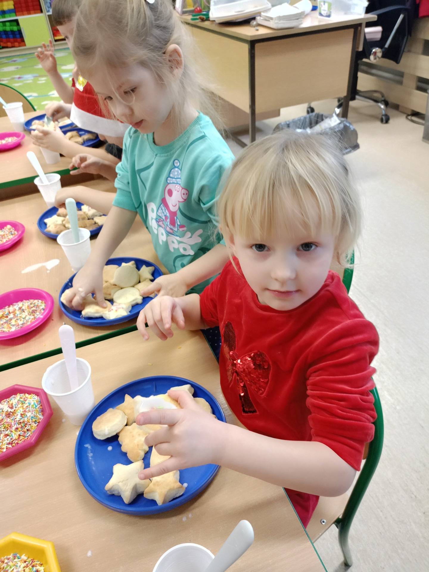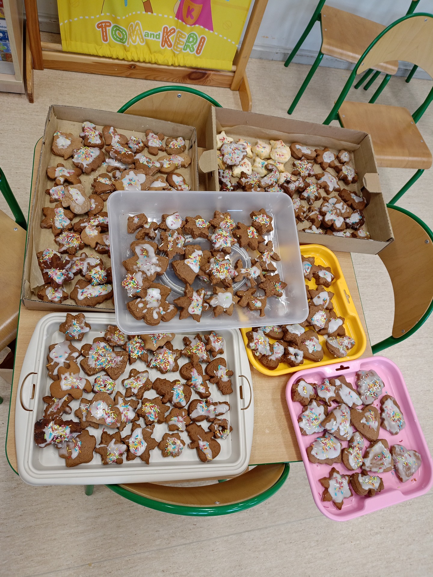Dziś dzieci lukrowały świąteczne ciasteczka: pierniki i kruche ciasteczka. To doświadczenie przyniosło im wiele radości, a skupienie i koncentracja na zadaniu były godne podziwu, co oddają załączone zdjęcia. Dzieci ozdobiły pokaźną ilość ciasteczek, które miały okazję spróbować, symbolicznie zabrać do domu. Pierniczkami będą częstowanie jeszcze kilkukrotnie do świąt, a część została przekazana na Jarmark Bożonarodzeniowy w Goluchowie.