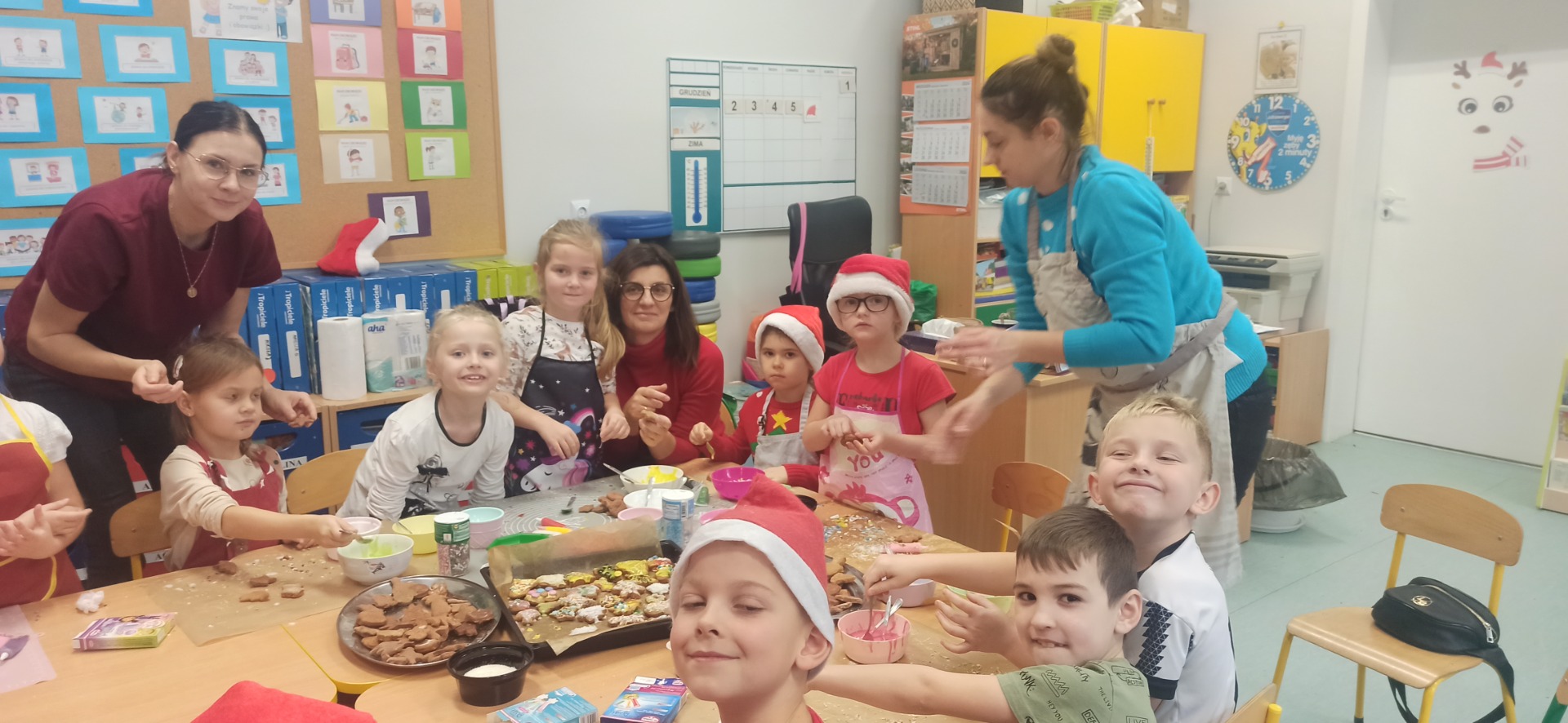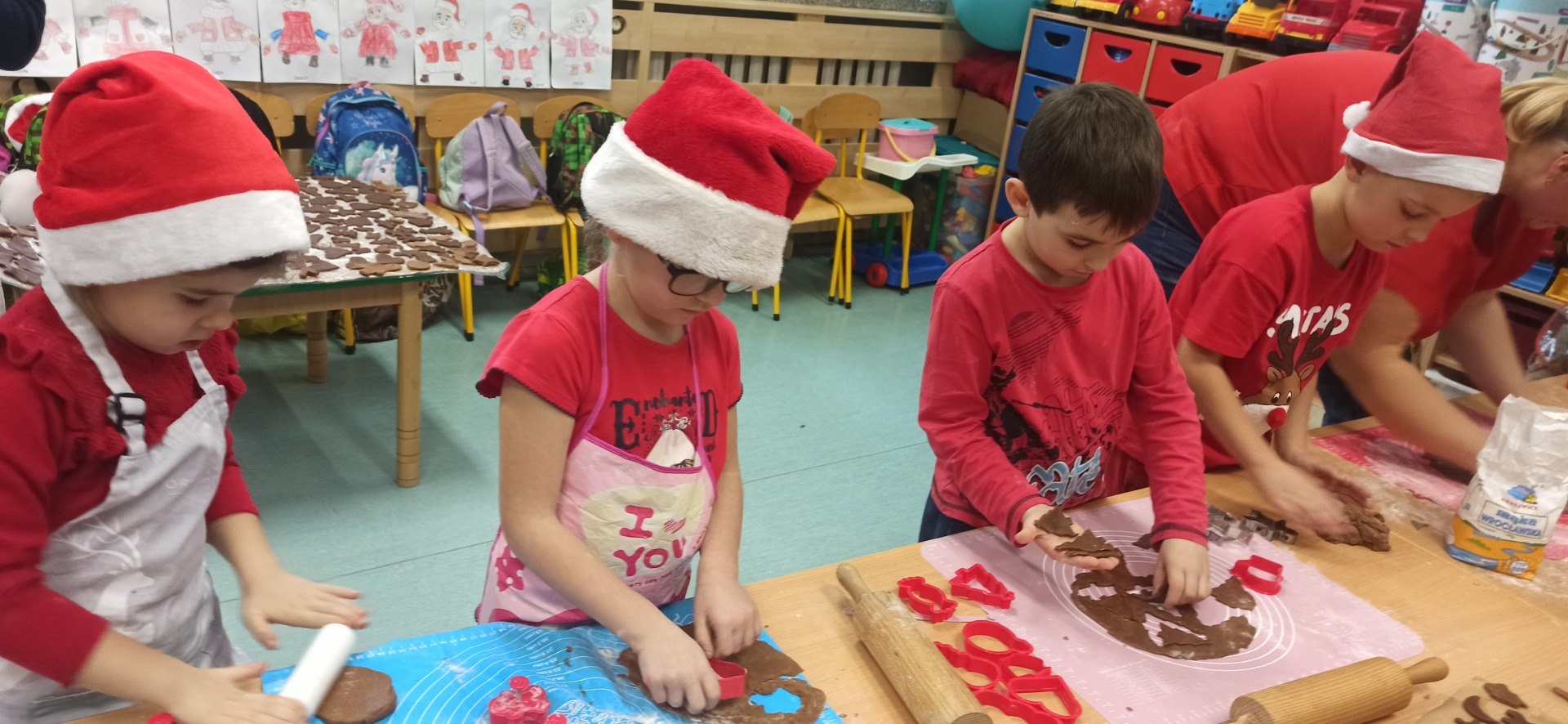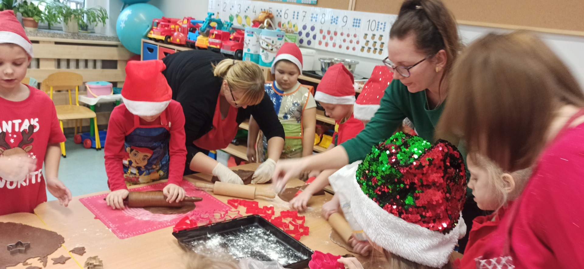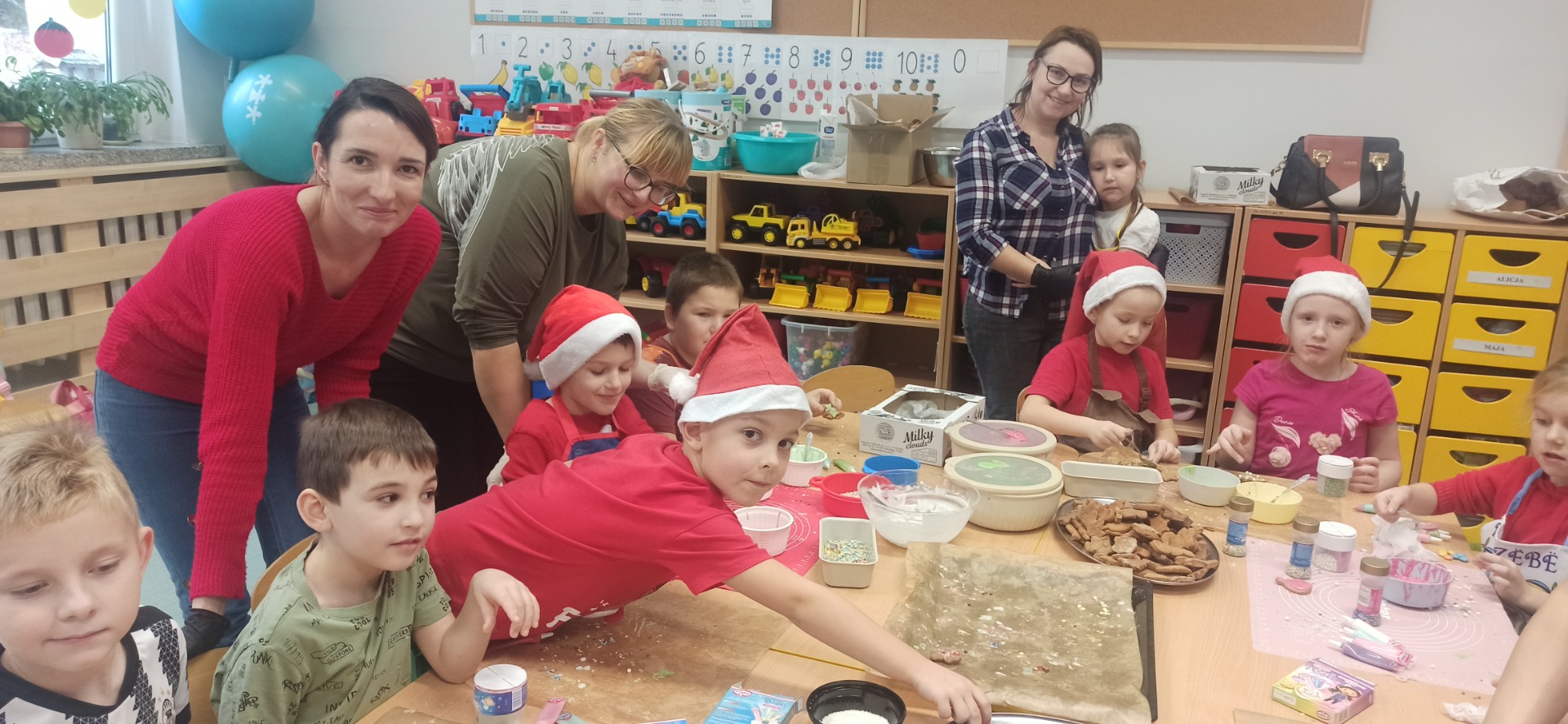 Dzieci z grupy motylki zgodnie z przedświąteczną tradycją piekły świąteczne pierniczki. Z pomocą kochanych mam praca z przygotowaniem wypieków szła sprawnie i bez trudu. Dzieci z wielkim zaangażowaniem wałkowały ciasto, wykrawały pierniki różnych kształtów przy pomocy foremek oraz dekorowały je lukrem i kolorowymi posypkami. W całym przedszkolu unosił się słodki zapach korzennych pierników, co wprawiło wszystkich w świąteczny nastrój.
