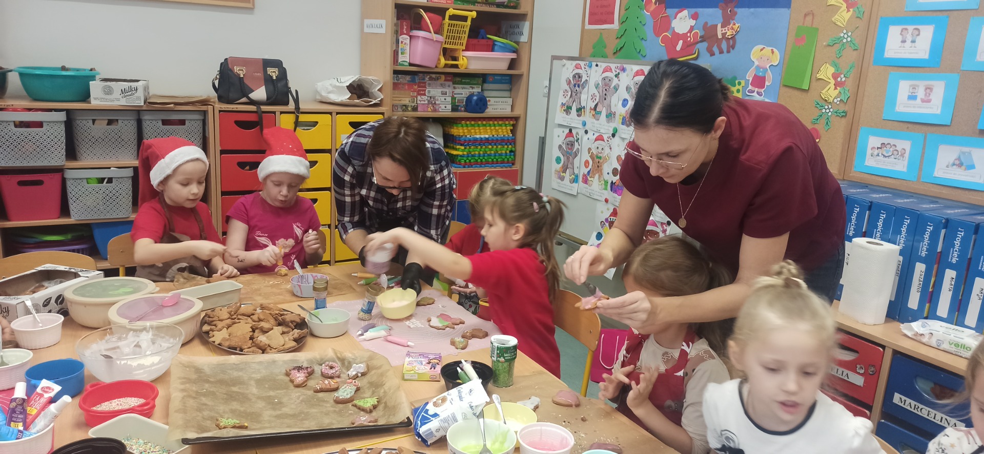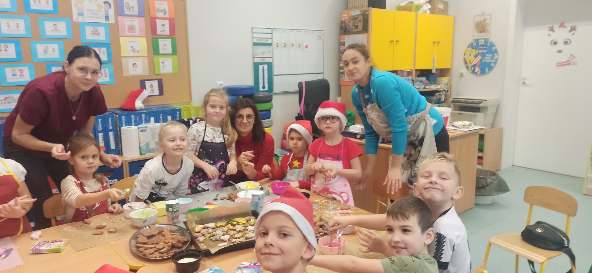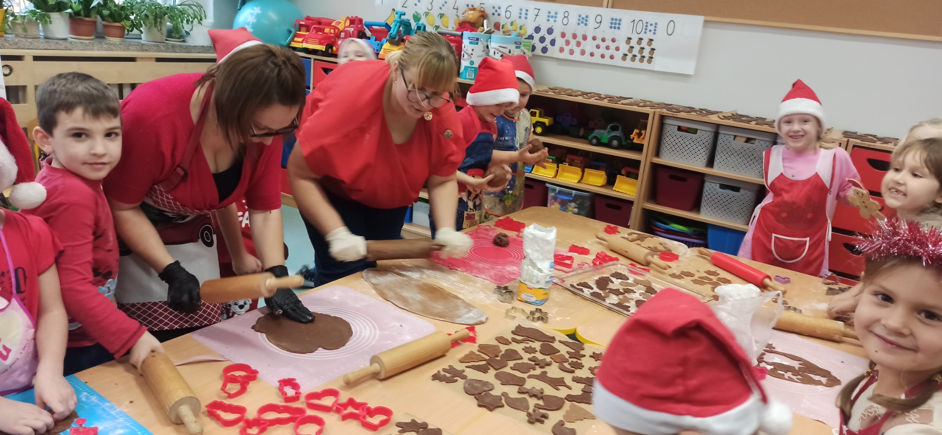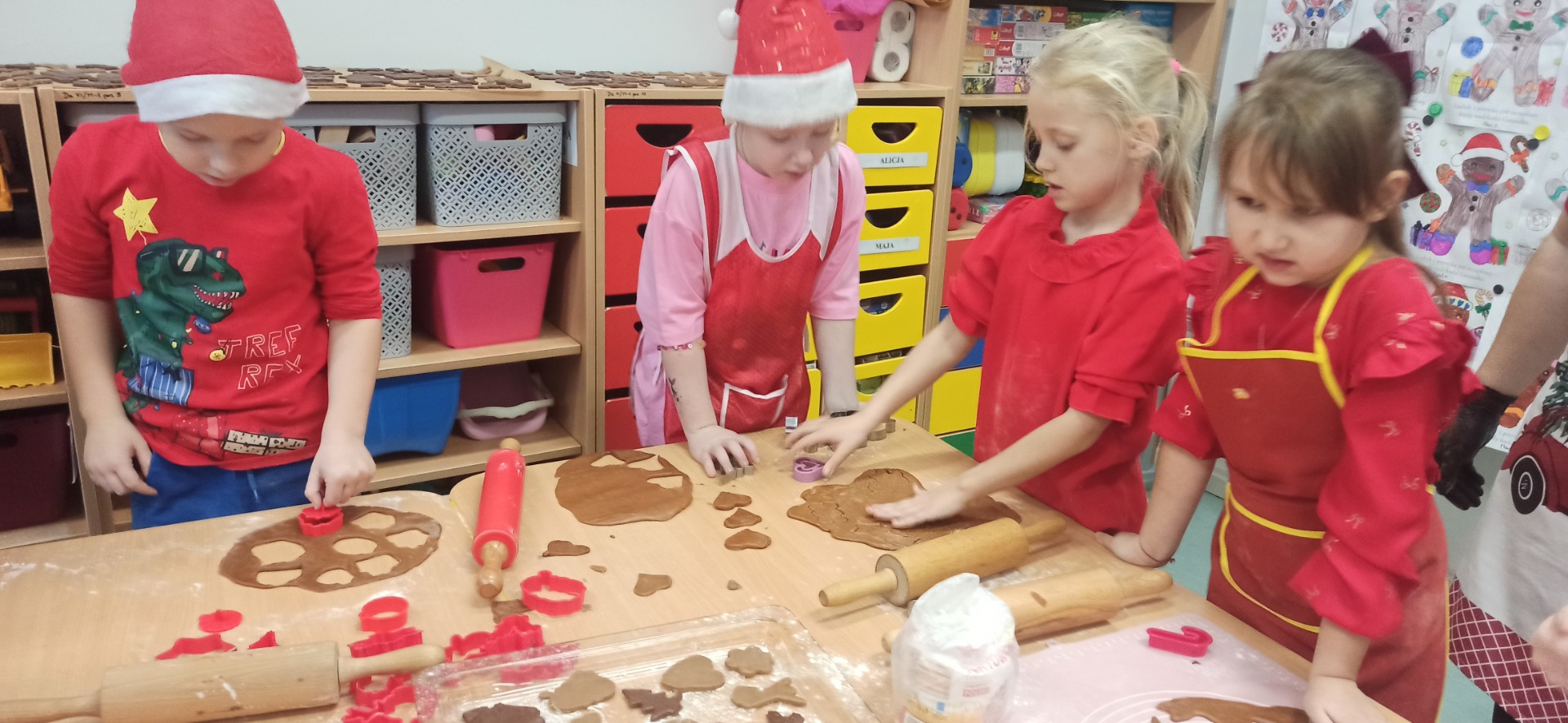 Dzieci z grupy motylki zgodnie z przedświąteczną tradycją piekły świąteczne pierniczki. Z pomocą kochanych mam praca z przygotowaniem wypieków szła sprawnie i bez trudu. Dzieci z wielkim zaangażowaniem wałkowały ciasto, wykrawały pierniki różnych kształtów przy pomocy foremek oraz dekorowały je lukrem i kolorowymi posypkami. W całym przedszkolu unosił się słodki zapach korzennych pierników, co wprawiło wszystkich w świąteczny nastrój.