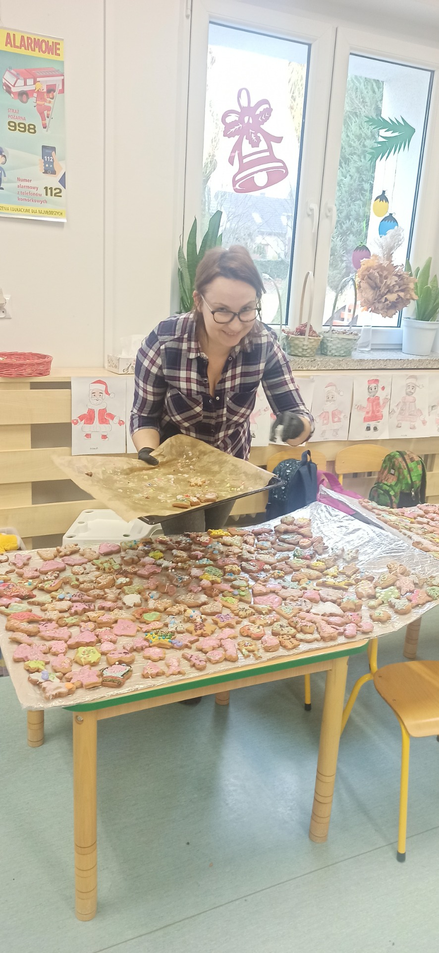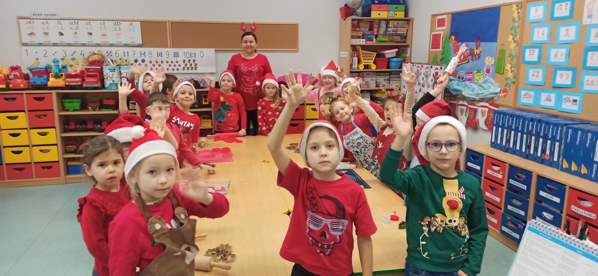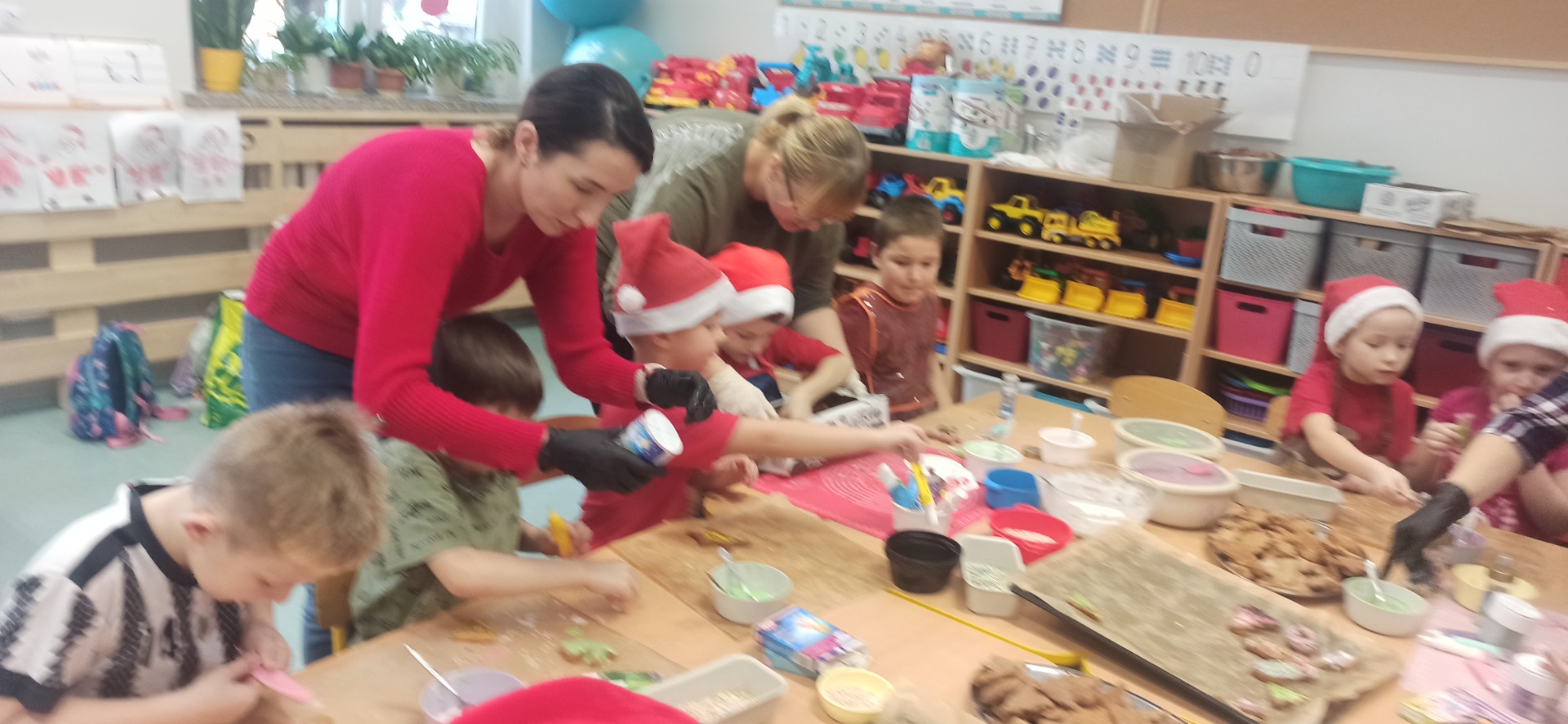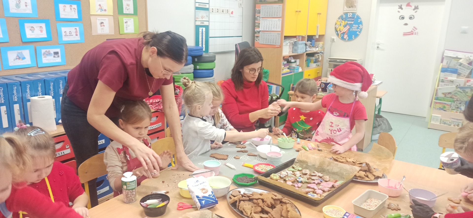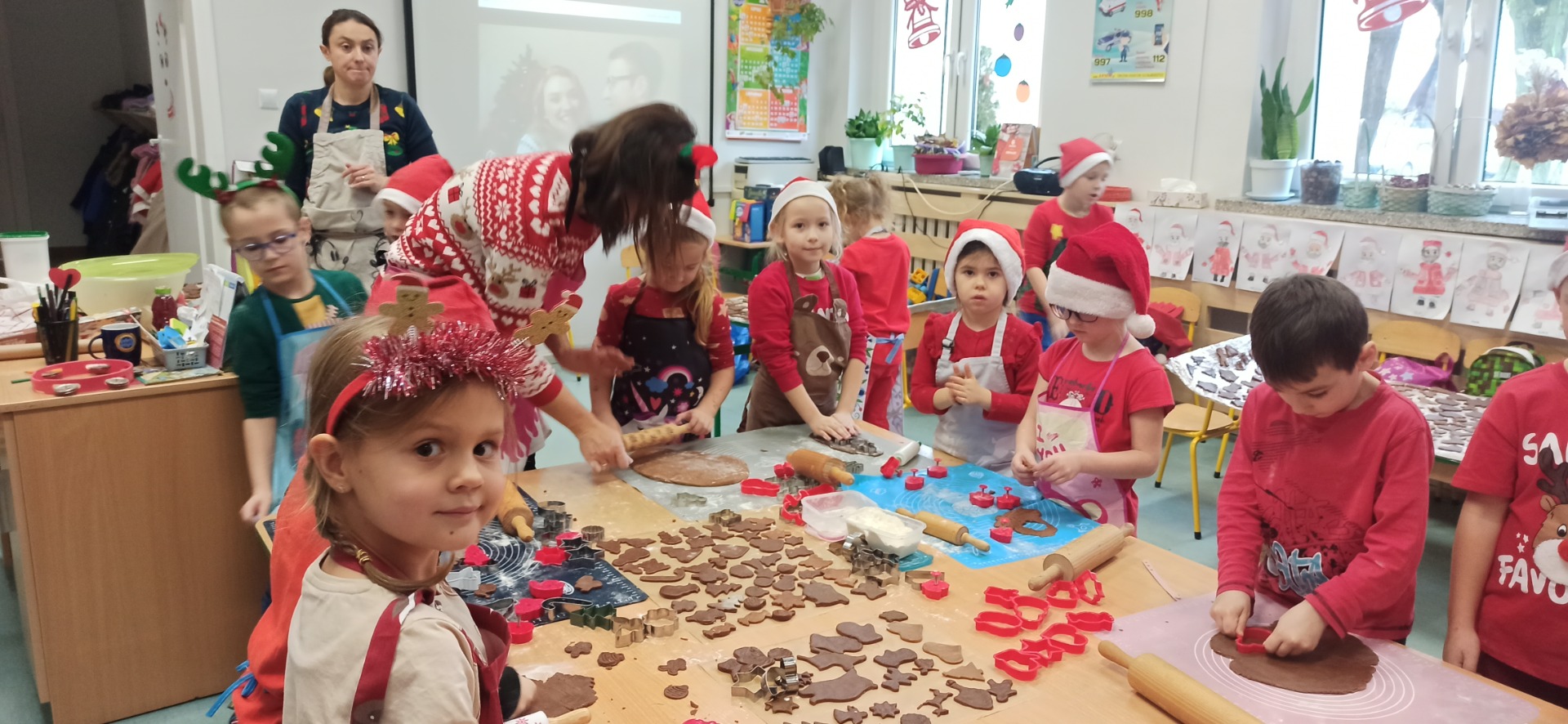 Dzieci z grupy motylki zgodnie z przedświąteczną tradycją piekły świąteczne pierniczki. Z pomocą kochanych mam praca z przygotowaniem wypieków szła sprawnie i bez trudu. Dzieci z wielkim zaangażowaniem wałkowały ciasto, wykrawały pierniki różnych kształtów przy pomocy foremek oraz dekorowały je lukrem i kolorowymi posypkami. W całym przedszkolu unosił się słodki zapach korzennych pierników, co wprawiło wszystkich w świąteczny nastrój.