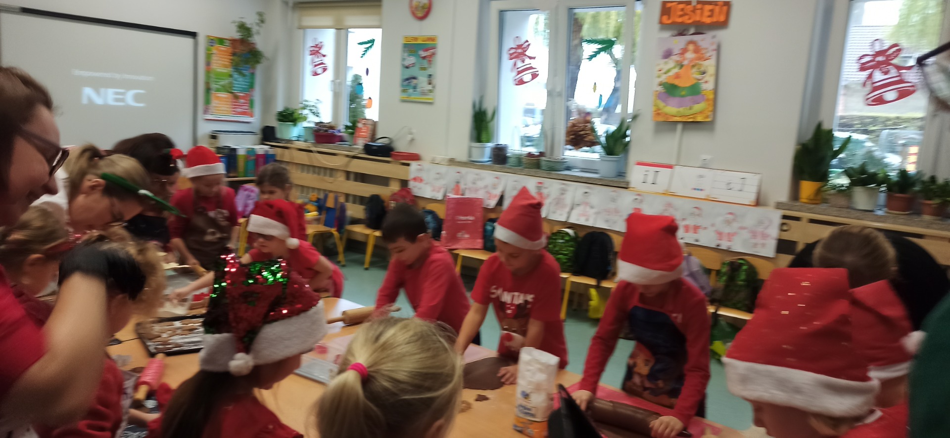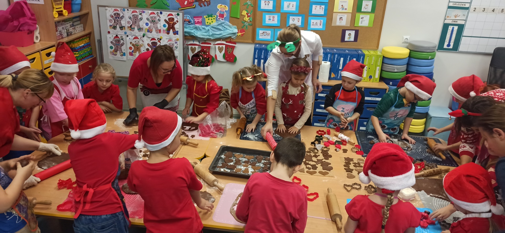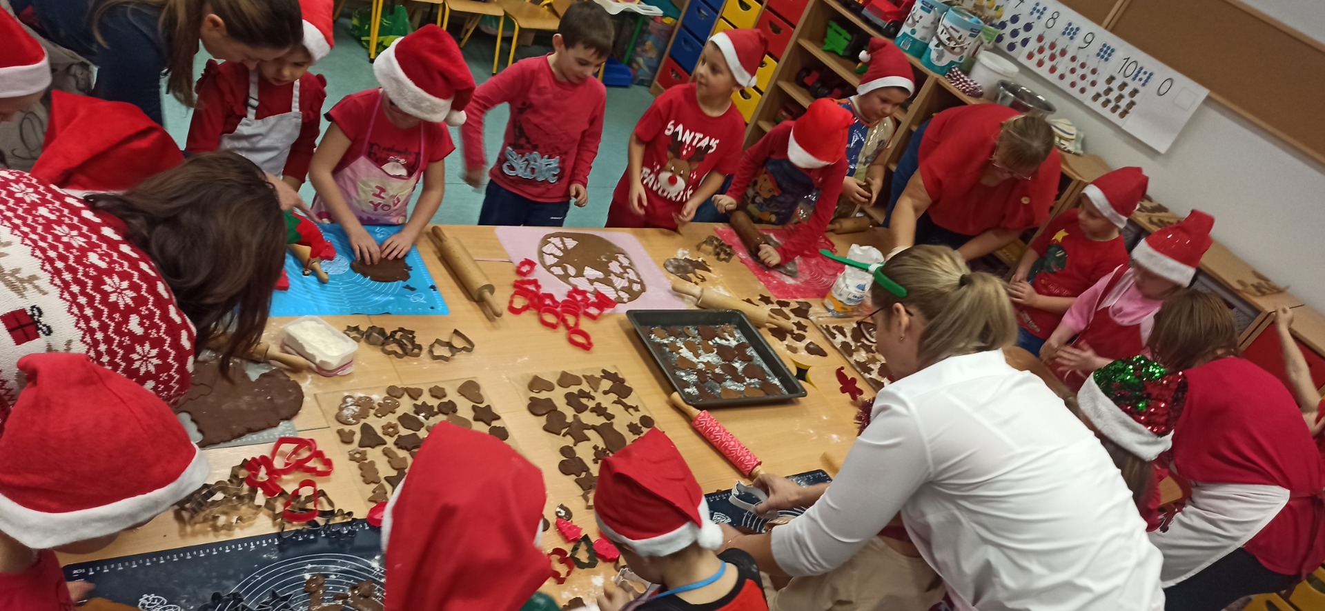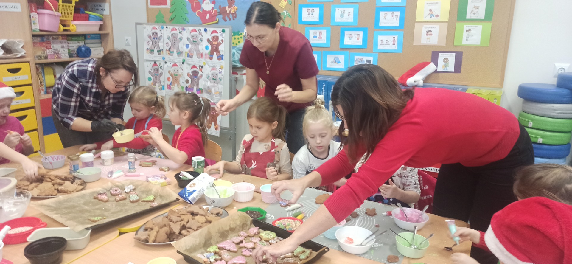 Dzieci z grupy motylki zgodnie z przedświąteczną tradycją piekły świąteczne pierniczki. Z pomocą kochanych mam praca z przygotowaniem wypieków szła sprawnie i bez trudu. Dzieci z wielkim zaangażowaniem wałkowały ciasto, wykrawały pierniki różnych kształtów przy pomocy foremek oraz dekorowały je lukrem i kolorowymi posypkami. W całym przedszkolu unosił się słodki zapach korzennych pierników, co wprawiło wszystkich w świąteczny nastrój.