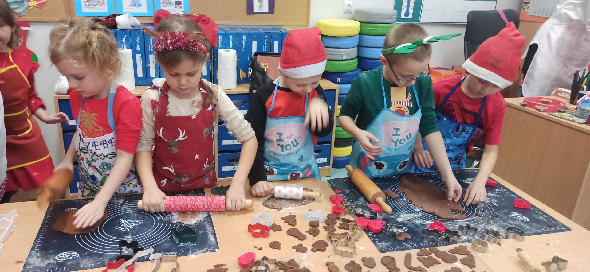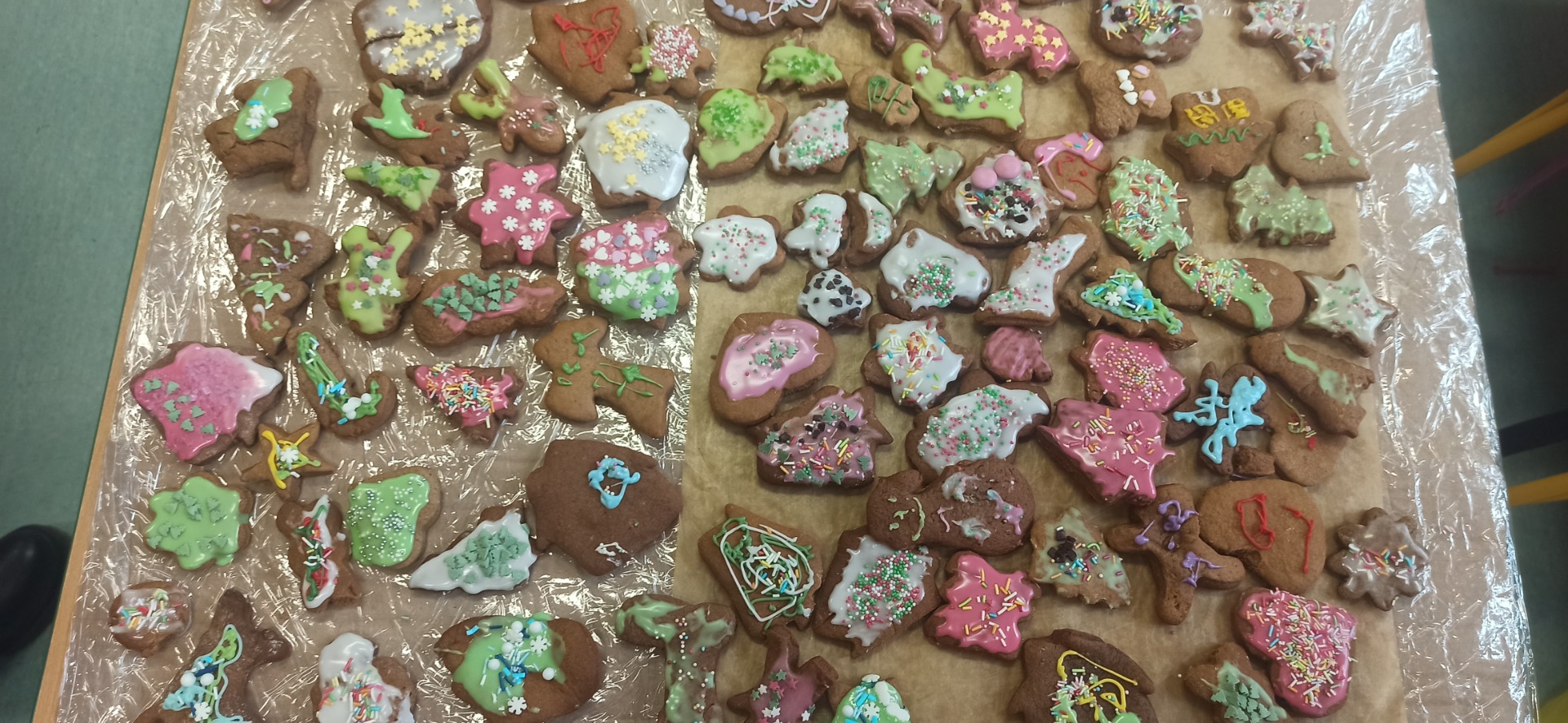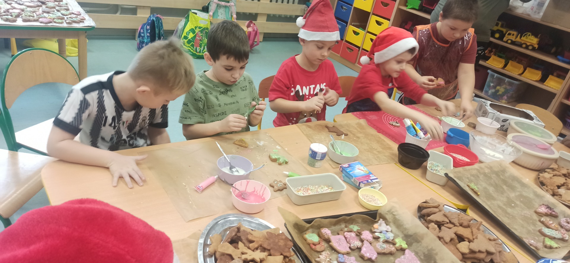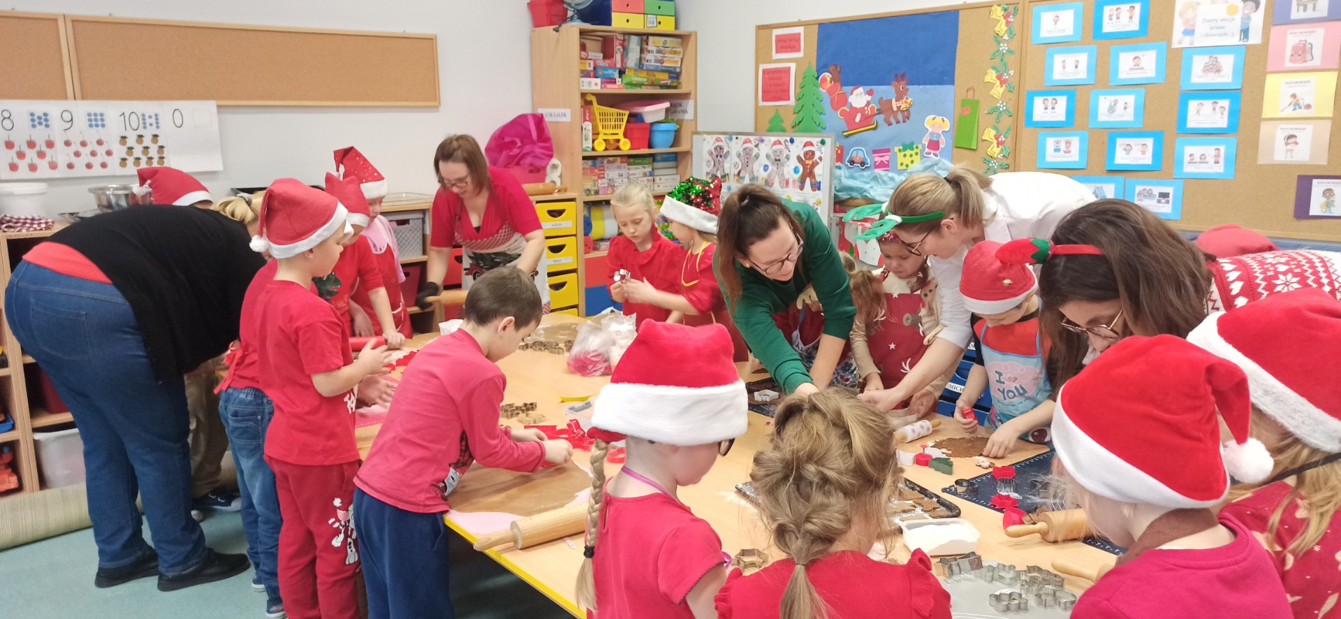 Dzieci z grupy motylki zgodnie z przedświąteczną tradycją piekły świąteczne pierniczki. Z pomocą kochanych mam praca z przygotowaniem wypieków szła sprawnie i bez trudu. Dzieci z wielkim zaangażowaniem wałkowały ciasto, wykrawały pierniki różnych kształtów przy pomocy foremek oraz dekorowały je lukrem i kolorowymi posypkami. W całym przedszkolu unosił się słodki zapach korzennych pierników, co wprawiło wszystkich w świąteczny nastrój.