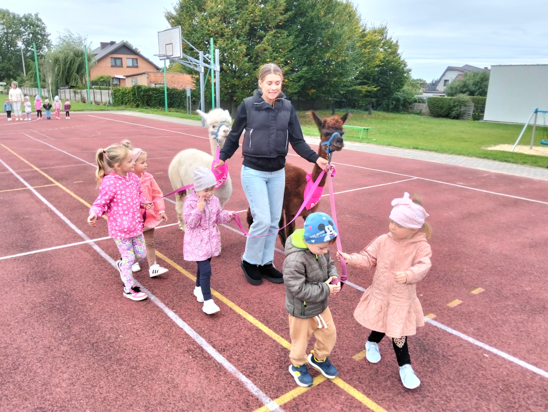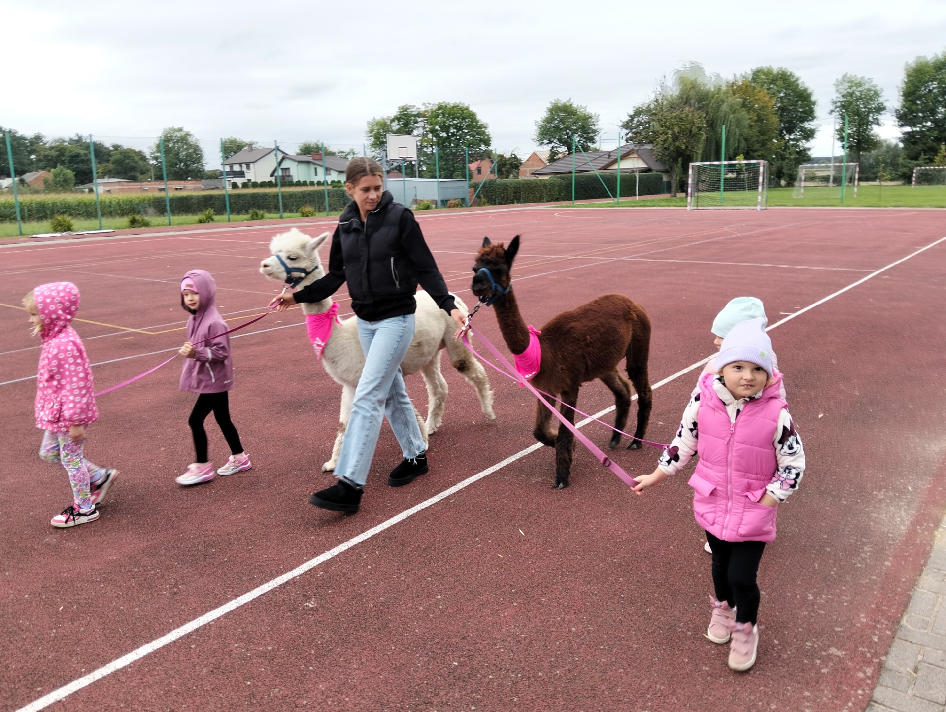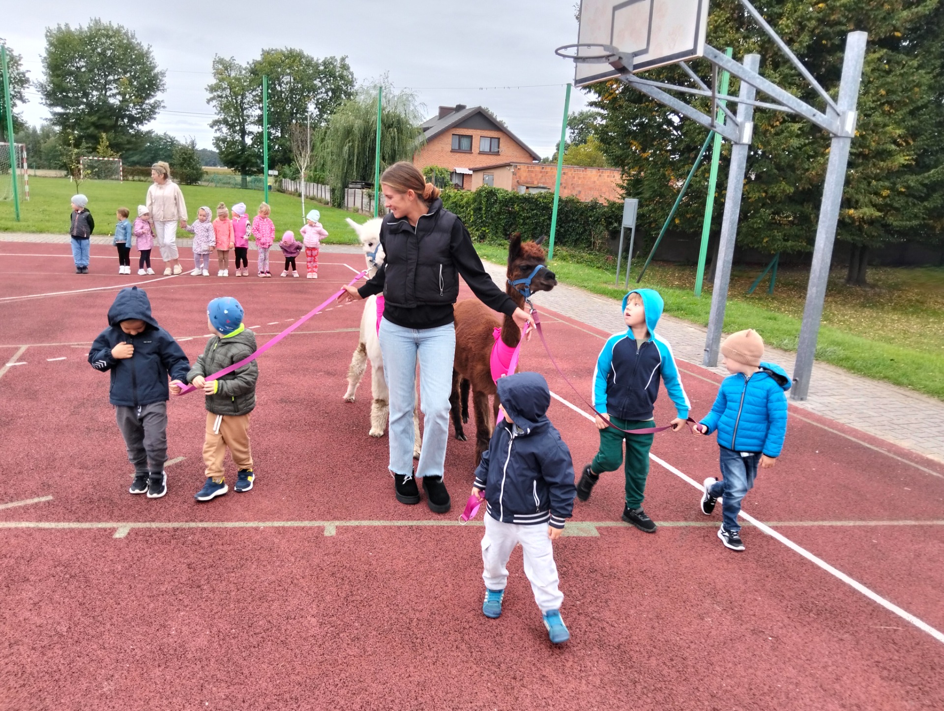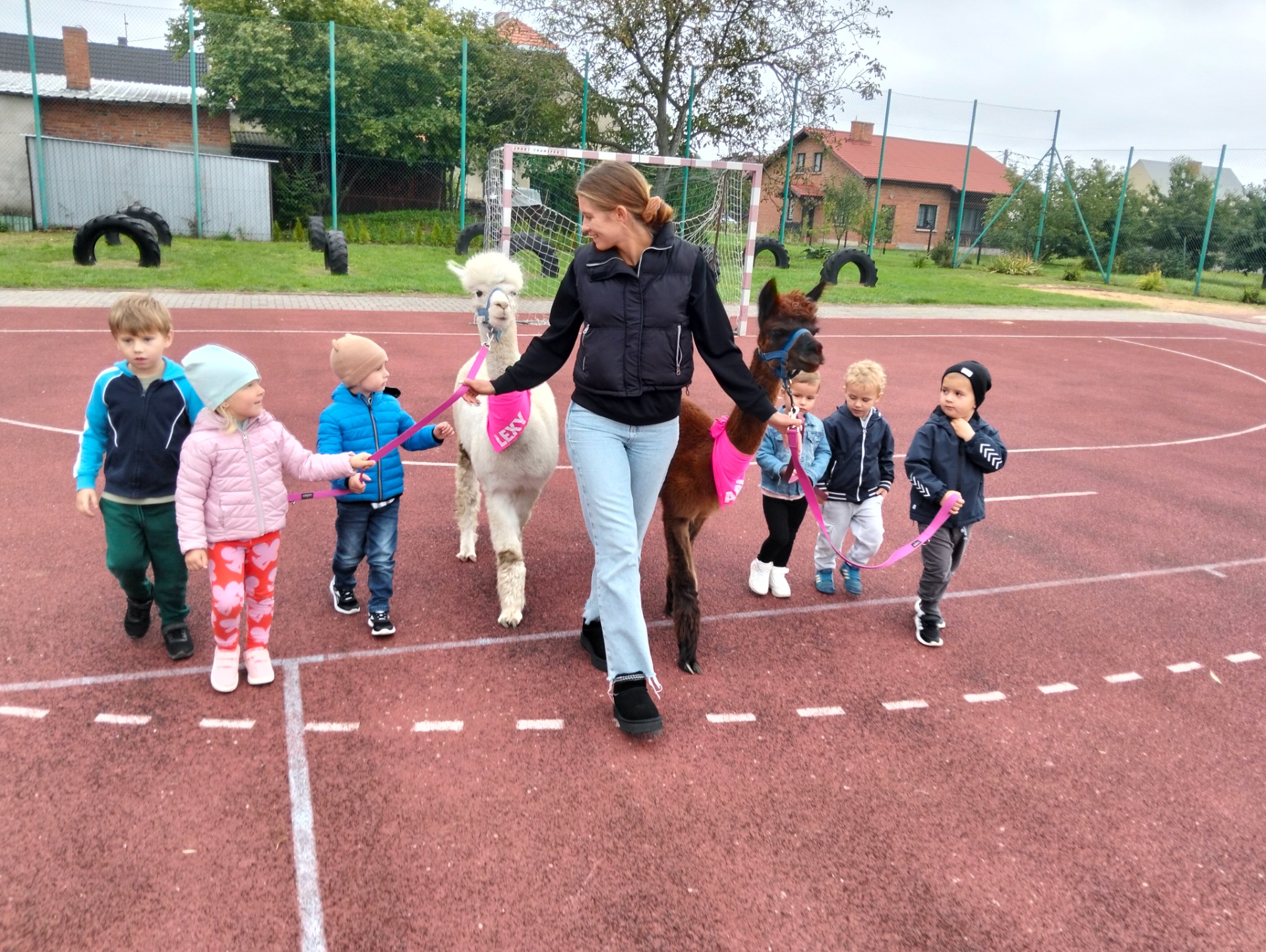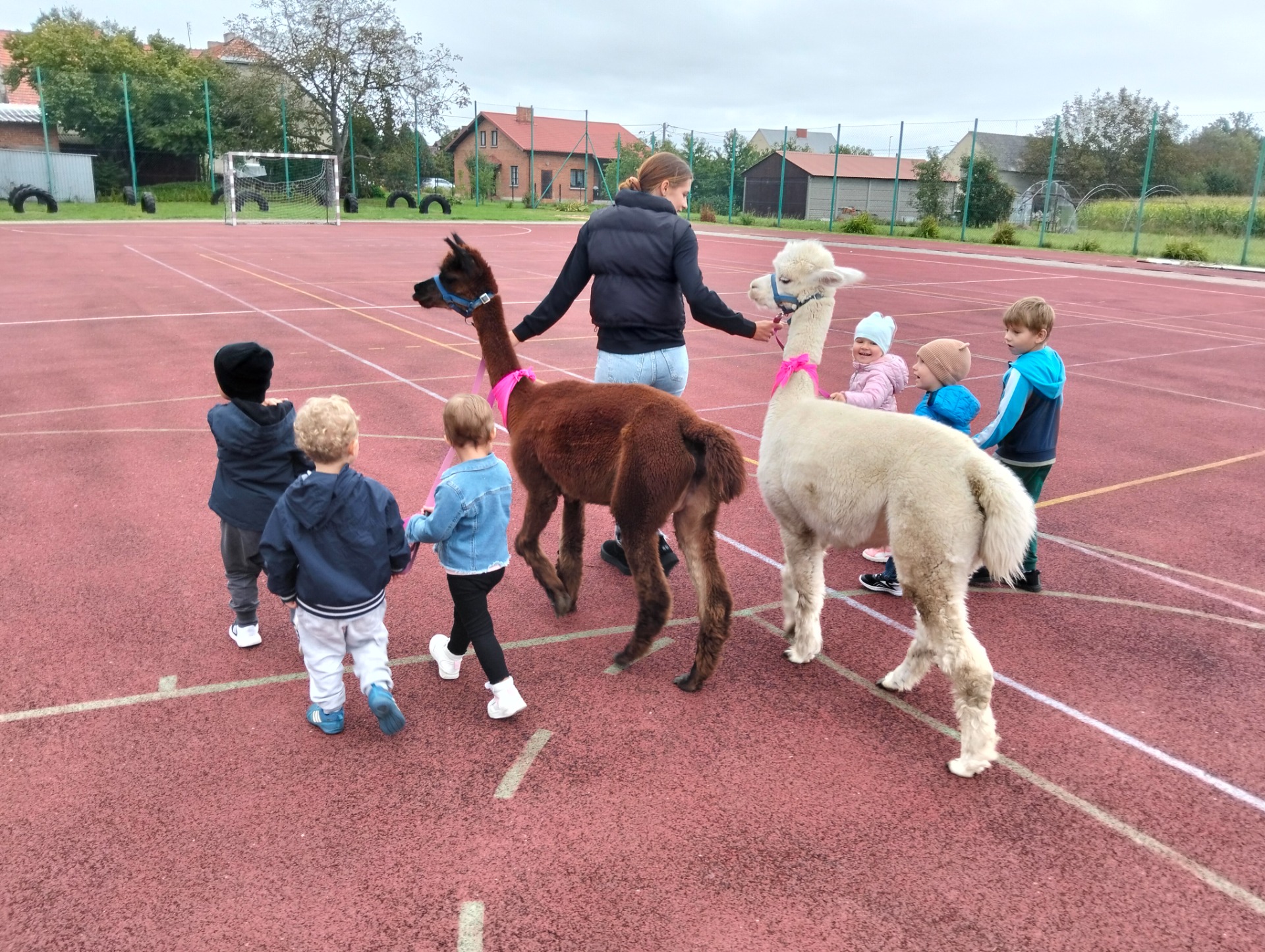 Dziś świętowaliśmy coroczny Dzień Przedszkolaka. Z tej okazji dzieci miały okazje pospacerować z Alpakami, które odwiedziły nas z pobliskiej stadniny, nakarmić je oraz pogłaskać. Zwierzęta bardzo spodobały się dzieciom. Z tej okazji dzieci zostały obdarowane kolorowymi piłkami oraz książeczkami. Bardzo dziękujemy mamie Kuby, która jako delegatka tutejszego KGW przygotowała dla dzieci watę cukrową. Był to dzień pełen uśmiechu i radości.