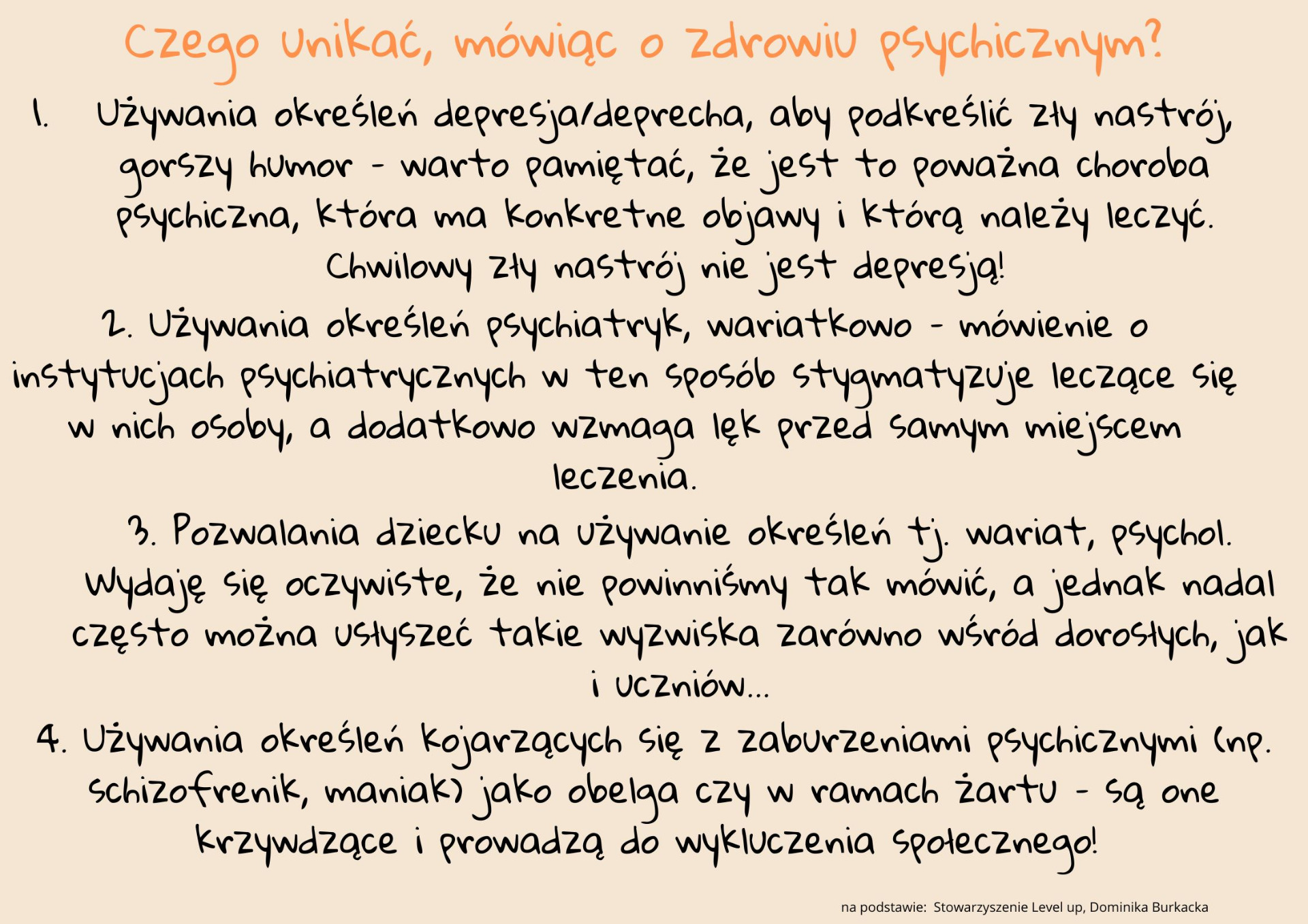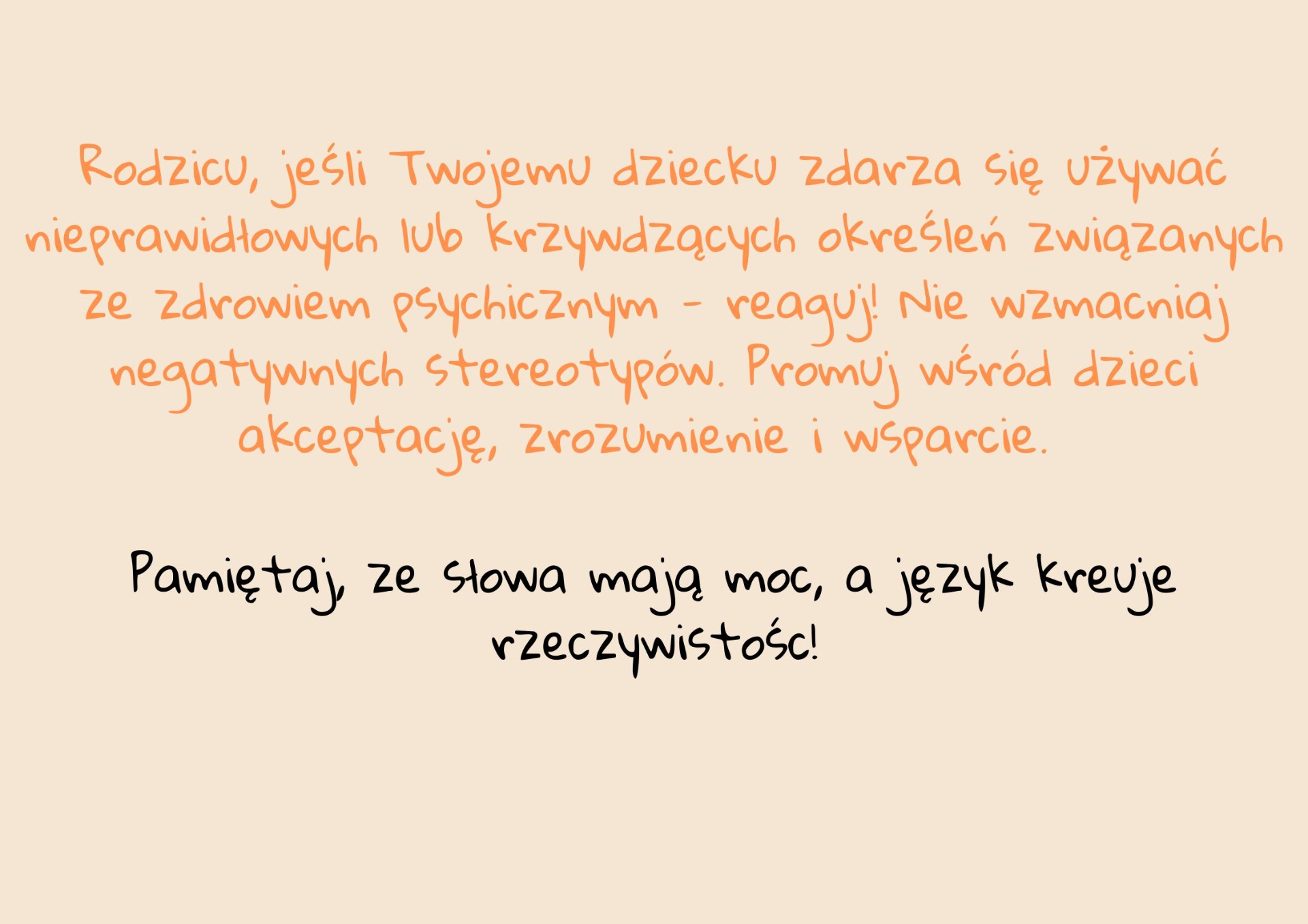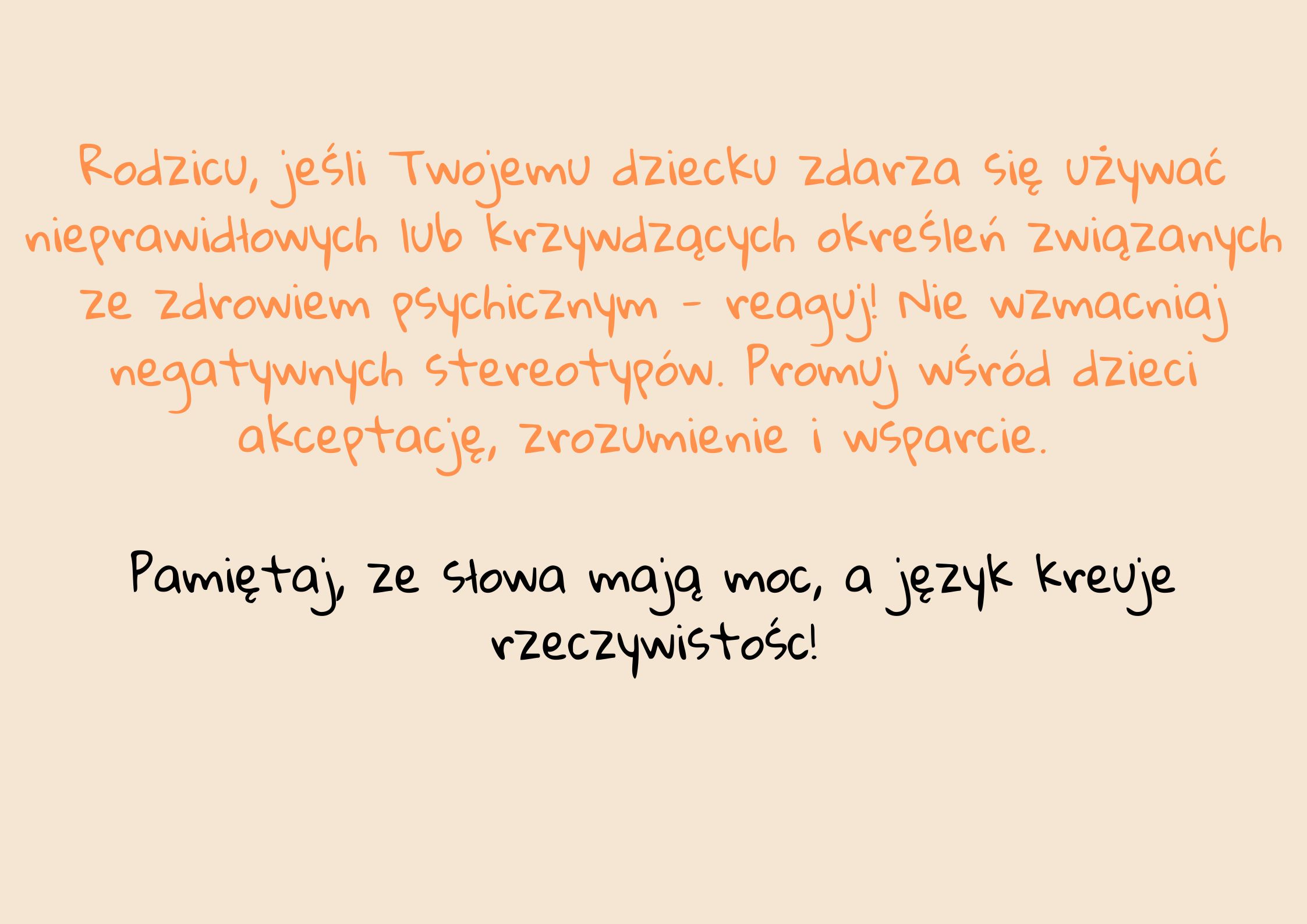 Już za kilka dni, bo 10 października czeka nas Światowy Dzień Zdrowia Psychicznego. Z tej okazji chcemy zwrócić Państwa uwagę na to, jak ważny jest odpowiedni dobór słów, którymi posługujemy się na co dzień, a które wbrew pozorom często nawiązują do problemów natury psychicznej. Niestety zdarza się, że używane przez nas zwroty są krzywdzące i stygmatyzujace... W związku z tym zachecamy do zapoznania się z grafikami mówiącymi o tym, czego lepiej unikać :)