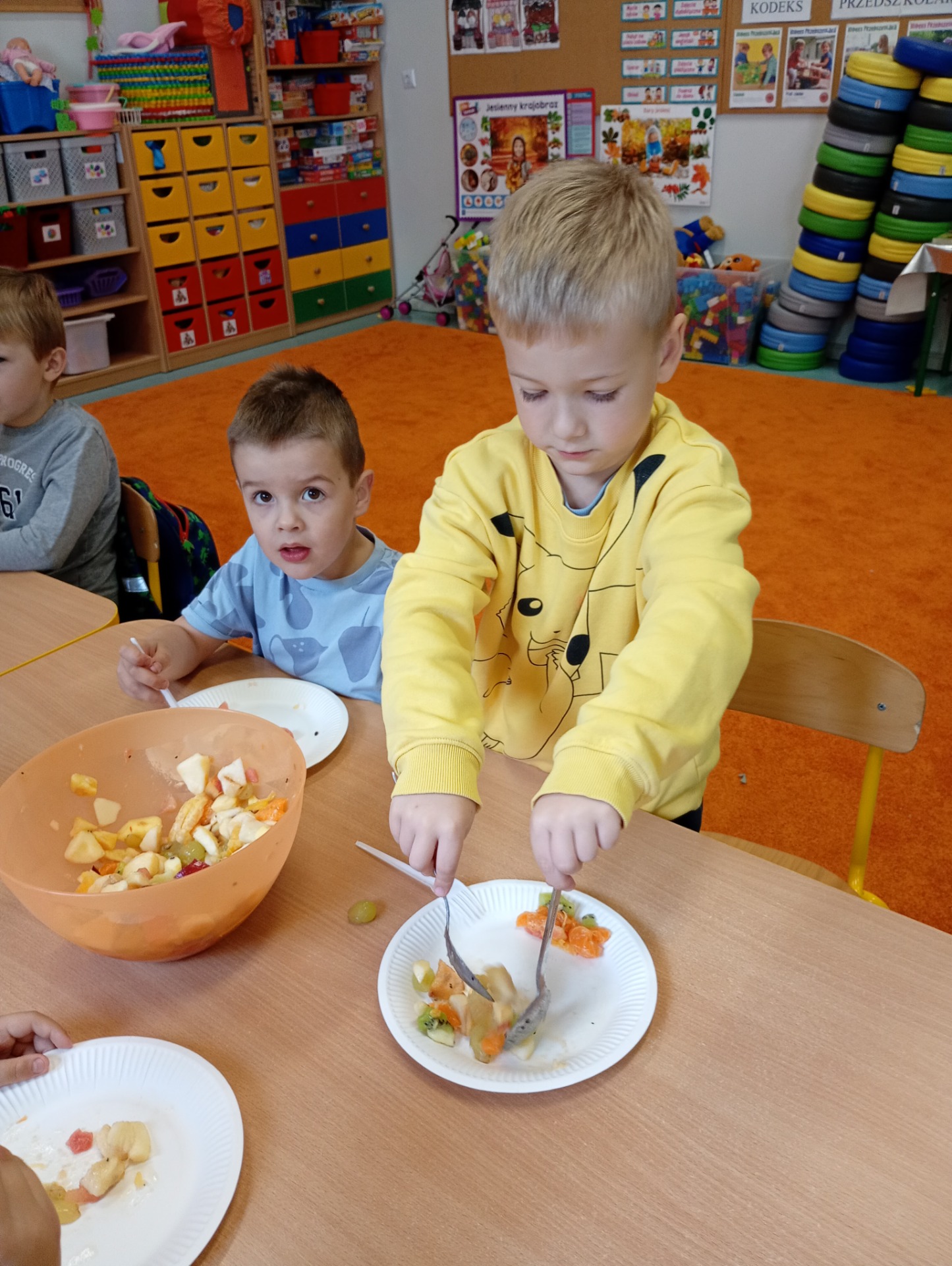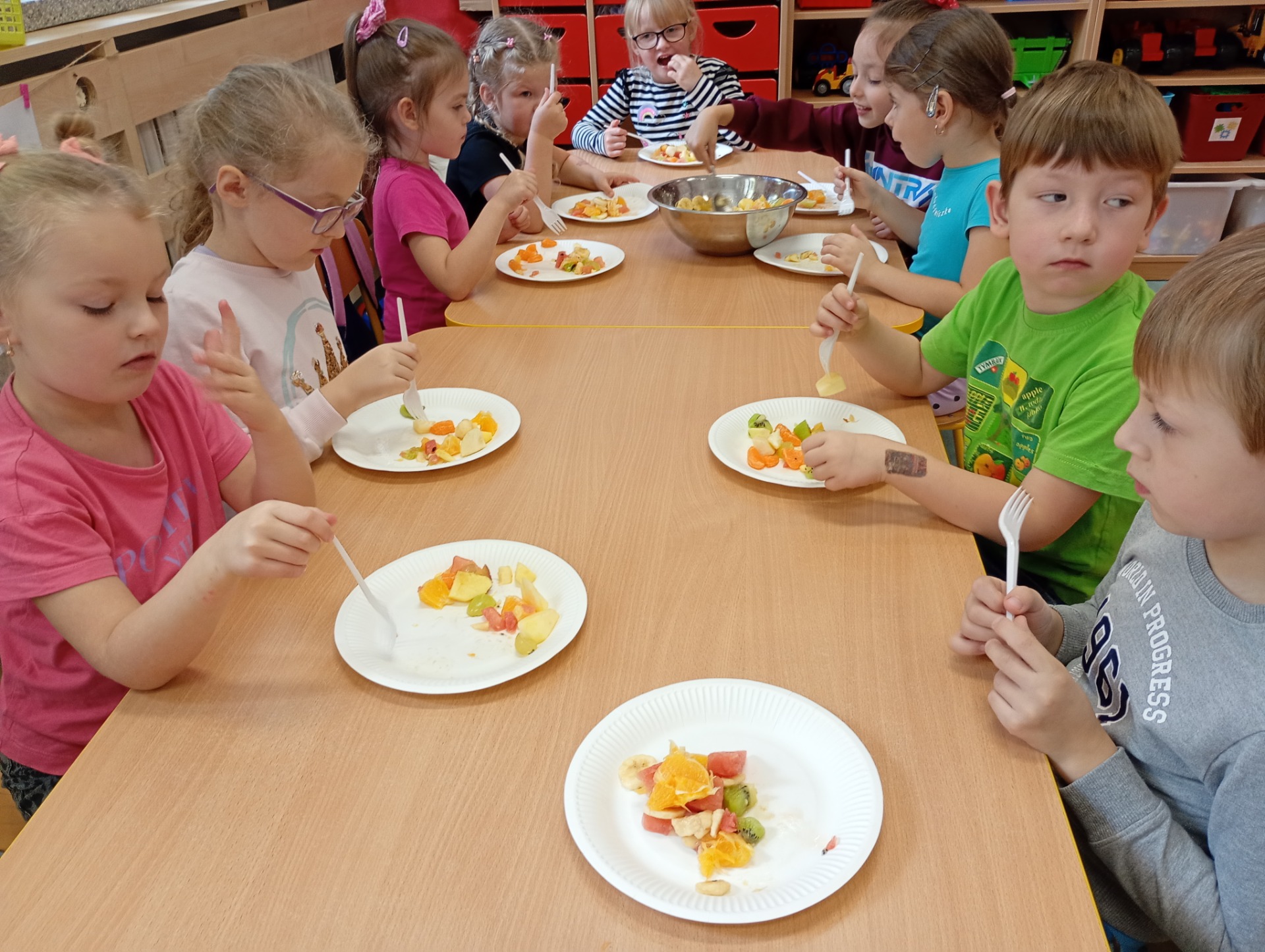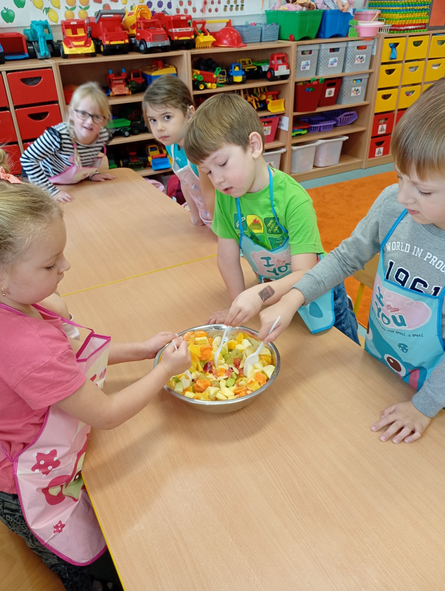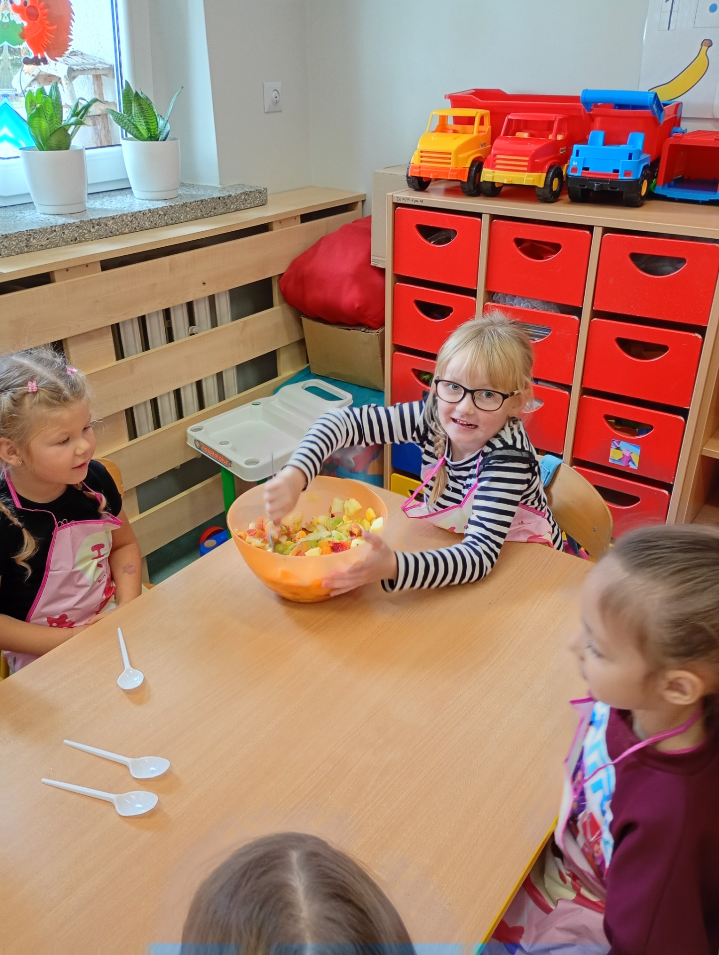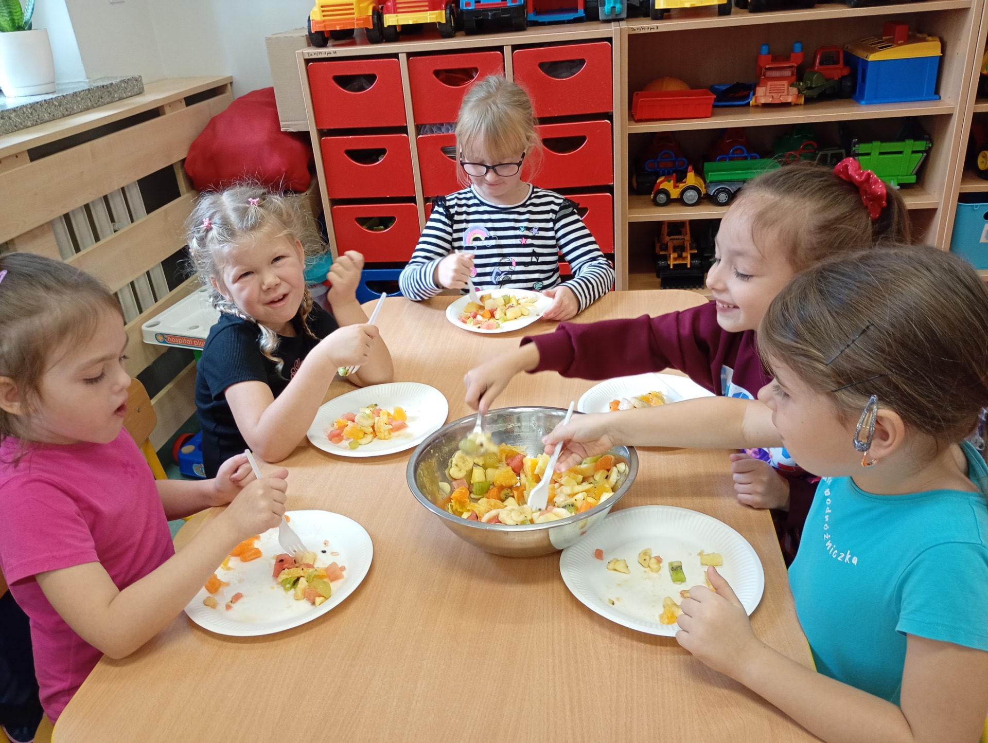 Przygotowywanie sa艂atki by艂o nie tylko 艣wietn膮 zabaw膮, ale tak偶e okazj膮 do rozmów o zdrowym od偶ywianiu oraz 膰wiczeniem samodzielno艣ci. Na zako艅czenie odby艂a si臋 degustacja, podczas której wszyscy z apetytem zajadali przygotowane smako艂yki. 馃崐馃崜馃崘