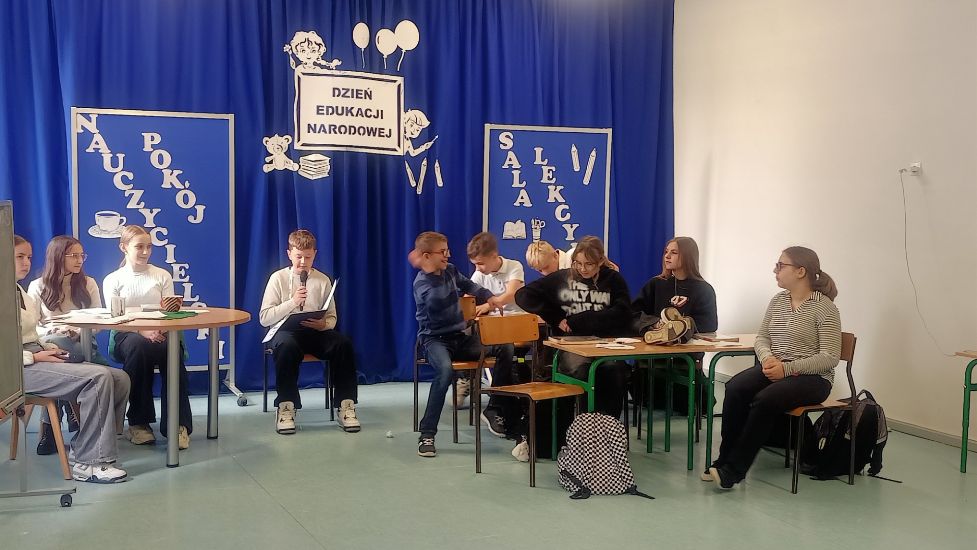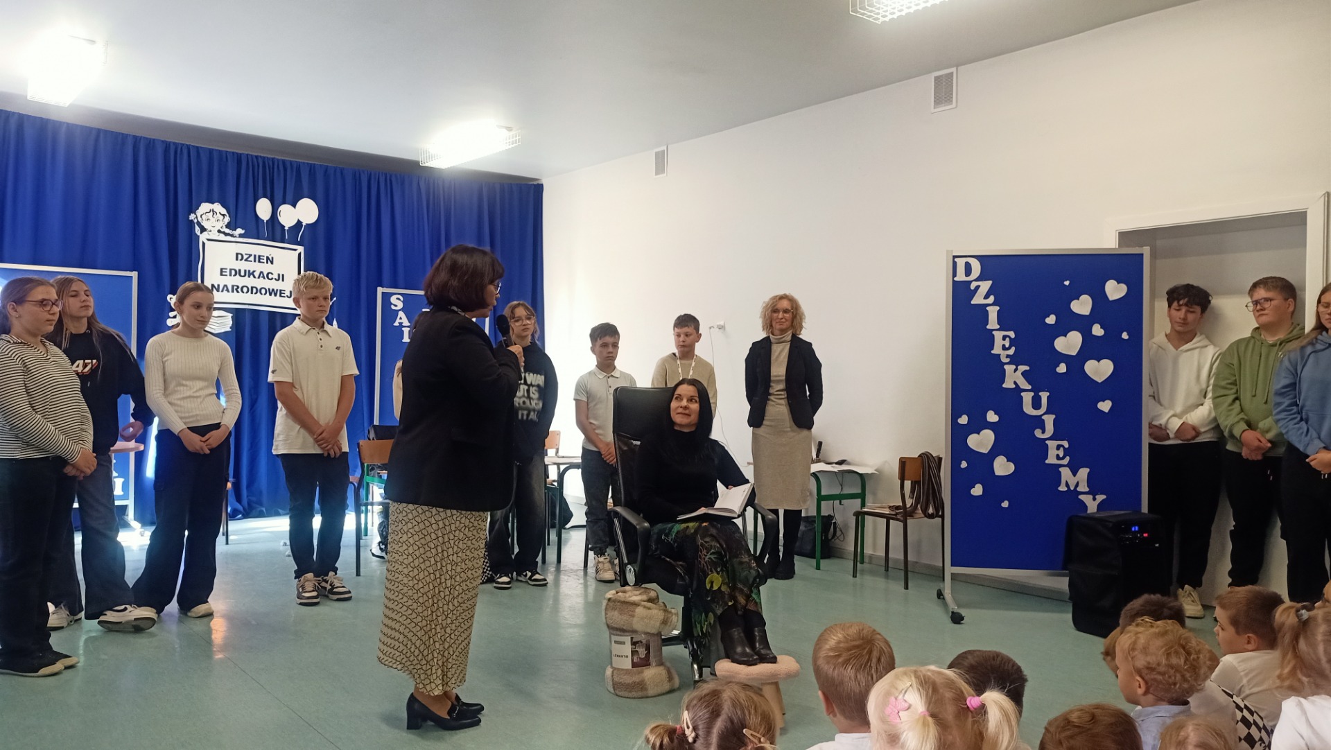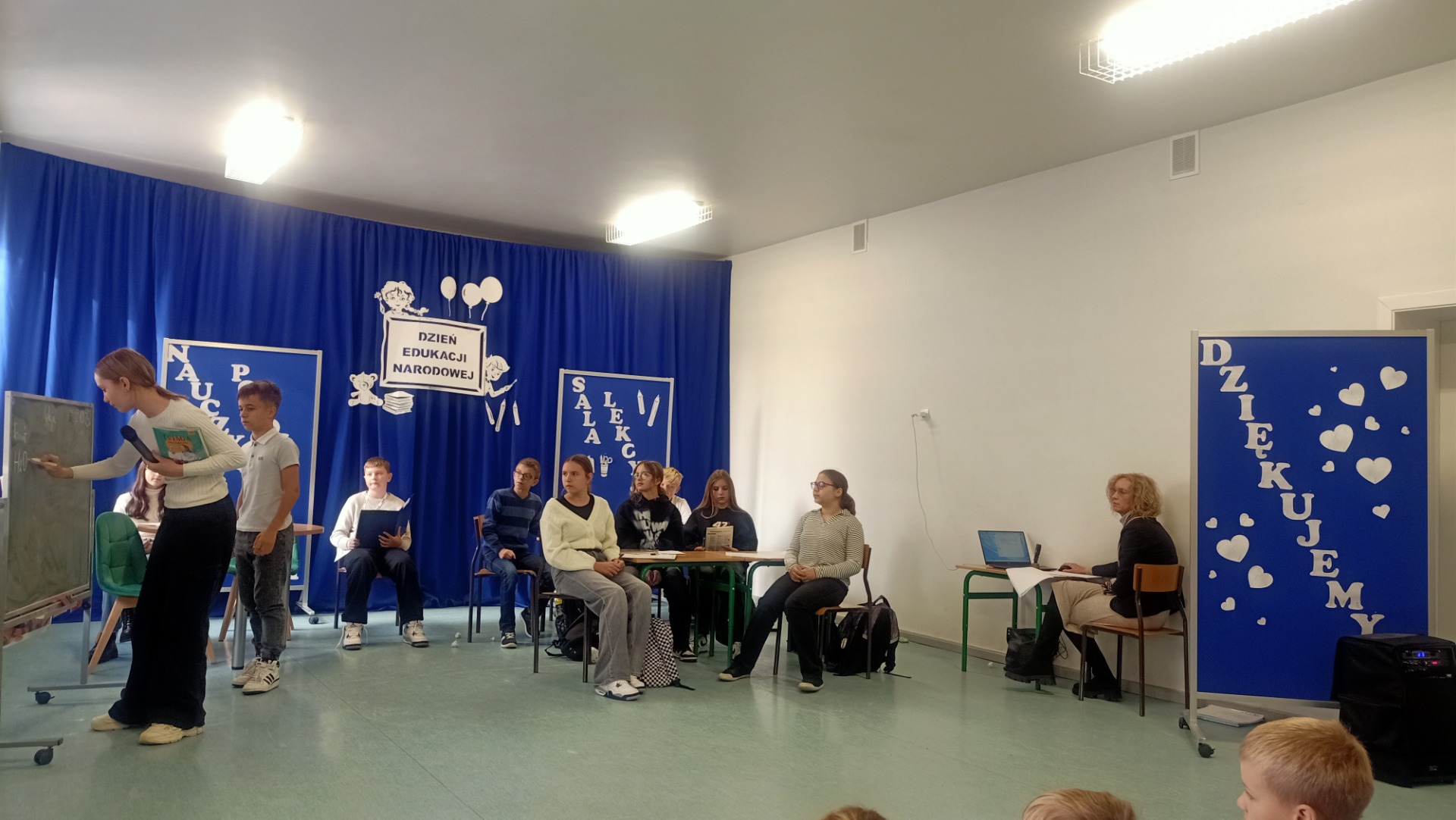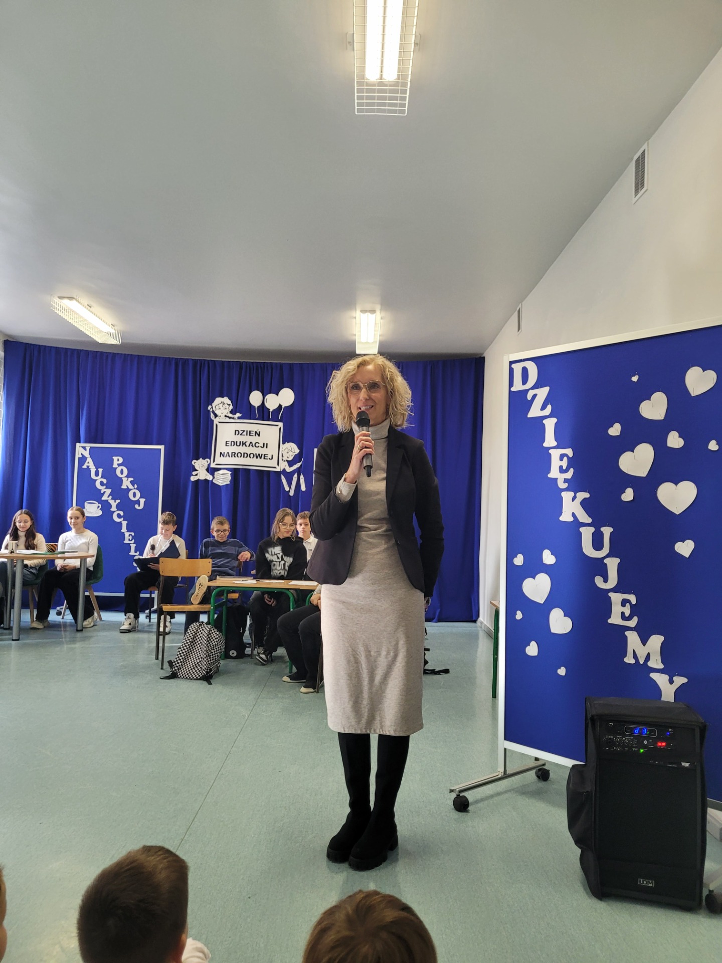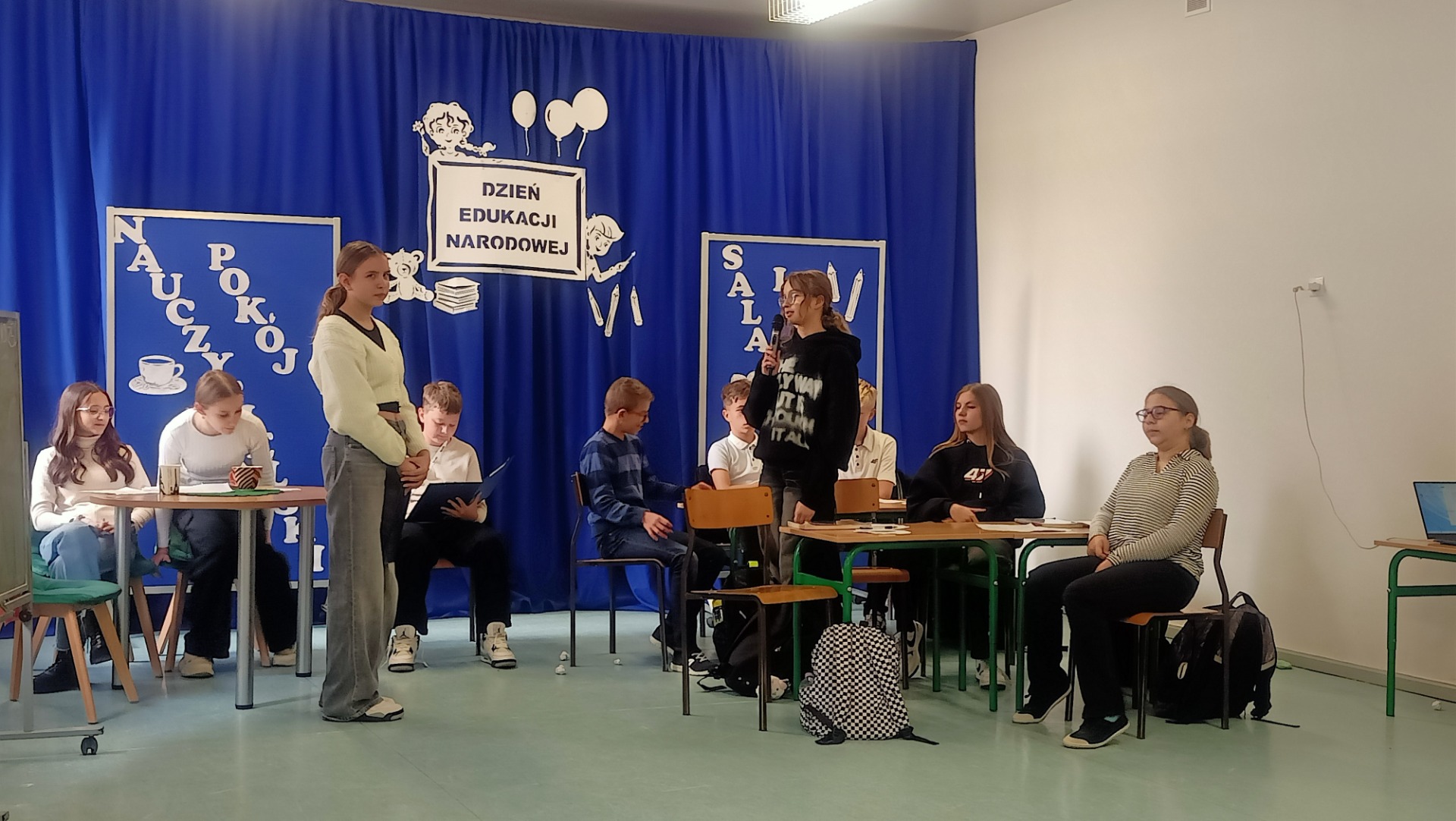 13 października uczciliśmy niezwykle ważny dzień - Dzień Edukacji Narodowej. Wśród żartów i zabawnych piosenek, znalazły się też serdeczne podziękowania dla wszystkich pracowników szkoły, bo dzięki nim uczniowie mają możliwość nie tylko zdobywać wiedzę i umiejętności, ale też bezpiecznie spędzać czas i nawiązywać przyjaźnie. Przy tak wyjątkowej okazji pożegnaliśmy panią Monikę Horzowską i życzyliśmy jej odpoczynku na zasłużonej emeryturze.