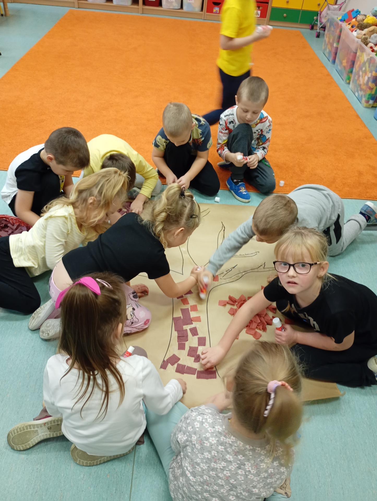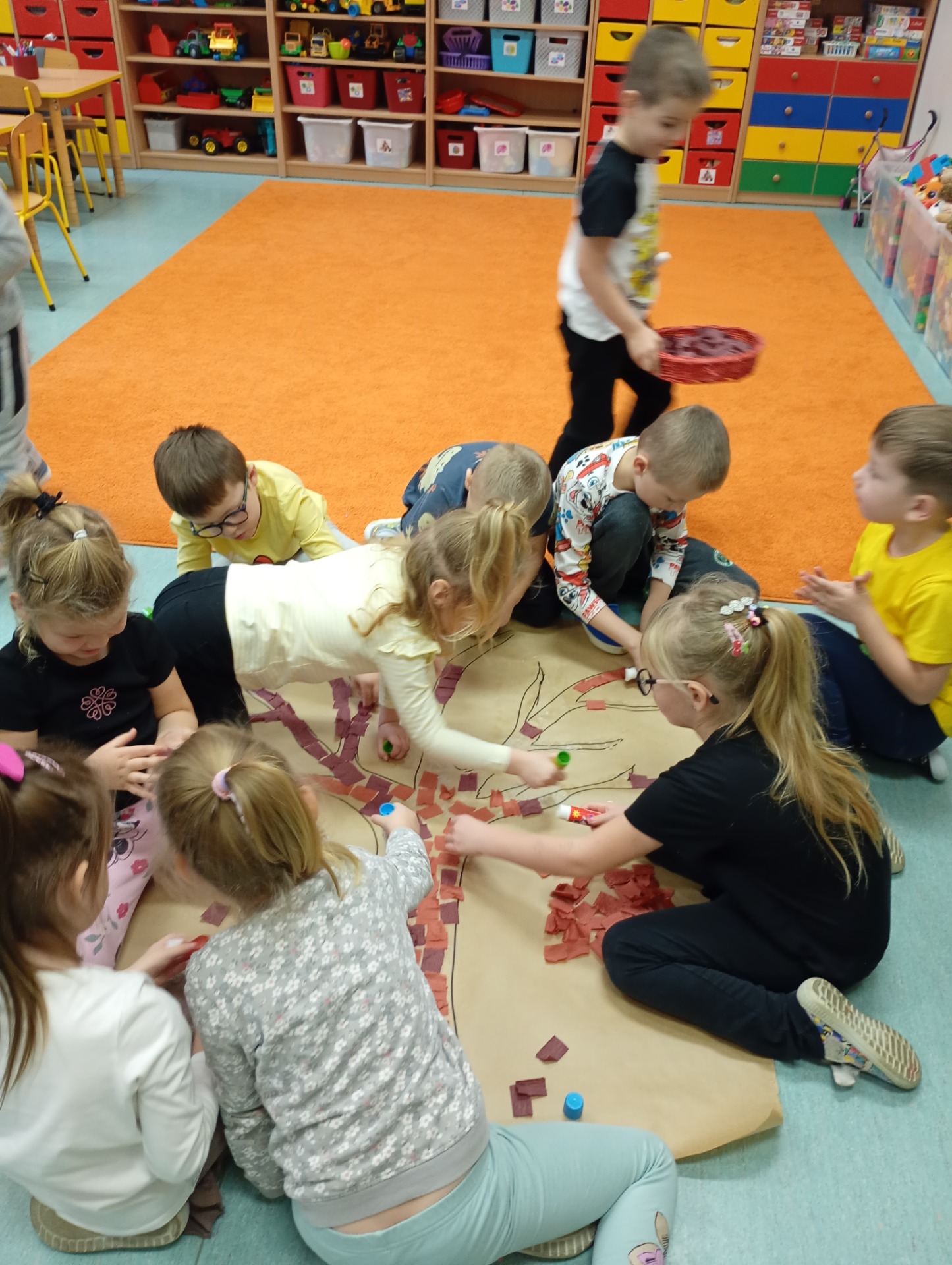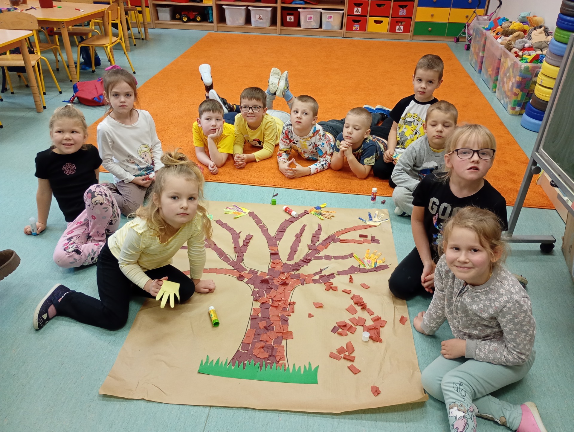 Dzieci wspólnie wykonały grupową pracę plastyczną – „Drzewo Życzliwości”. Powstała piękna praca, którą można podziwiać na przedszkolnym korytarzu.