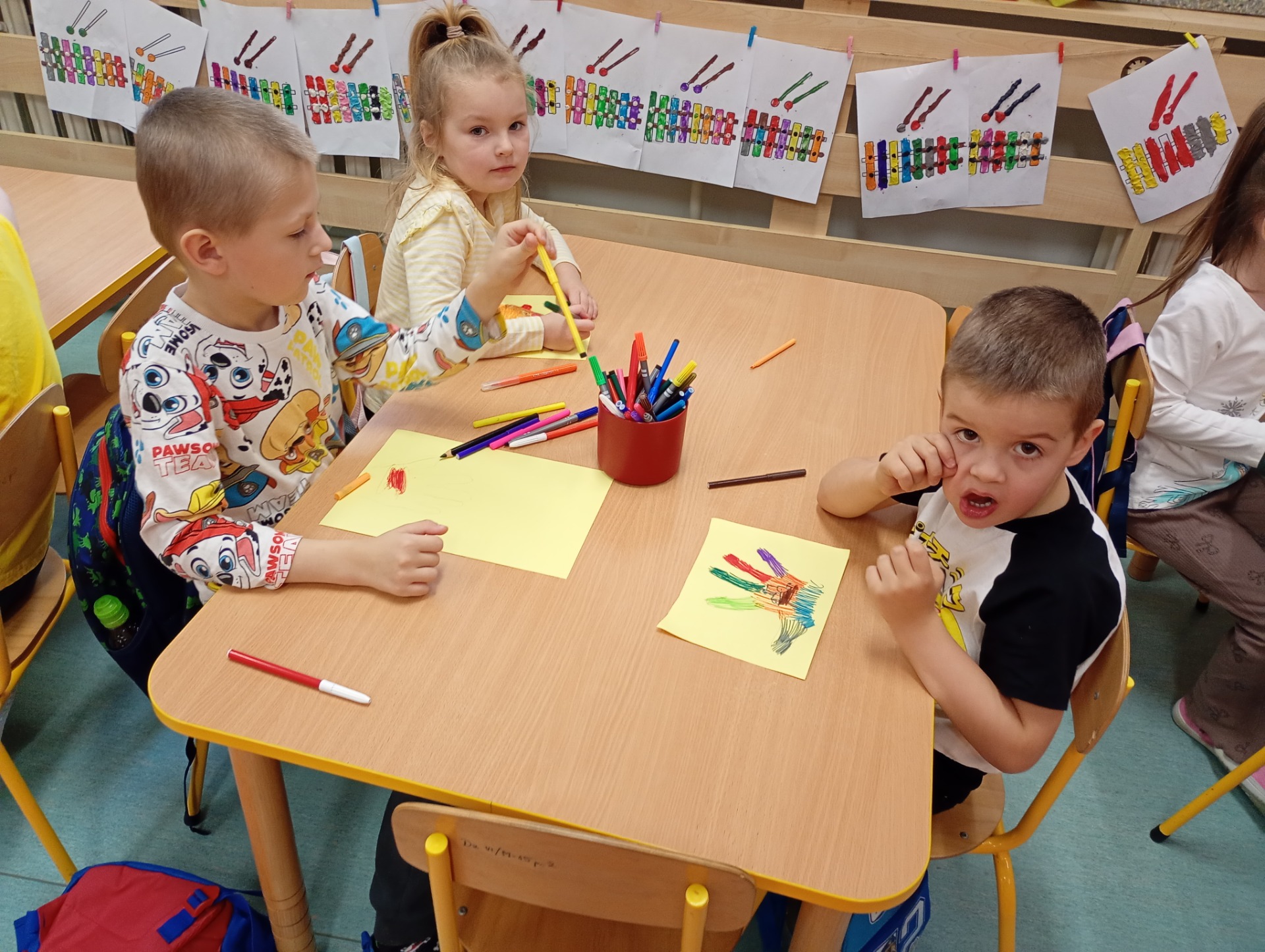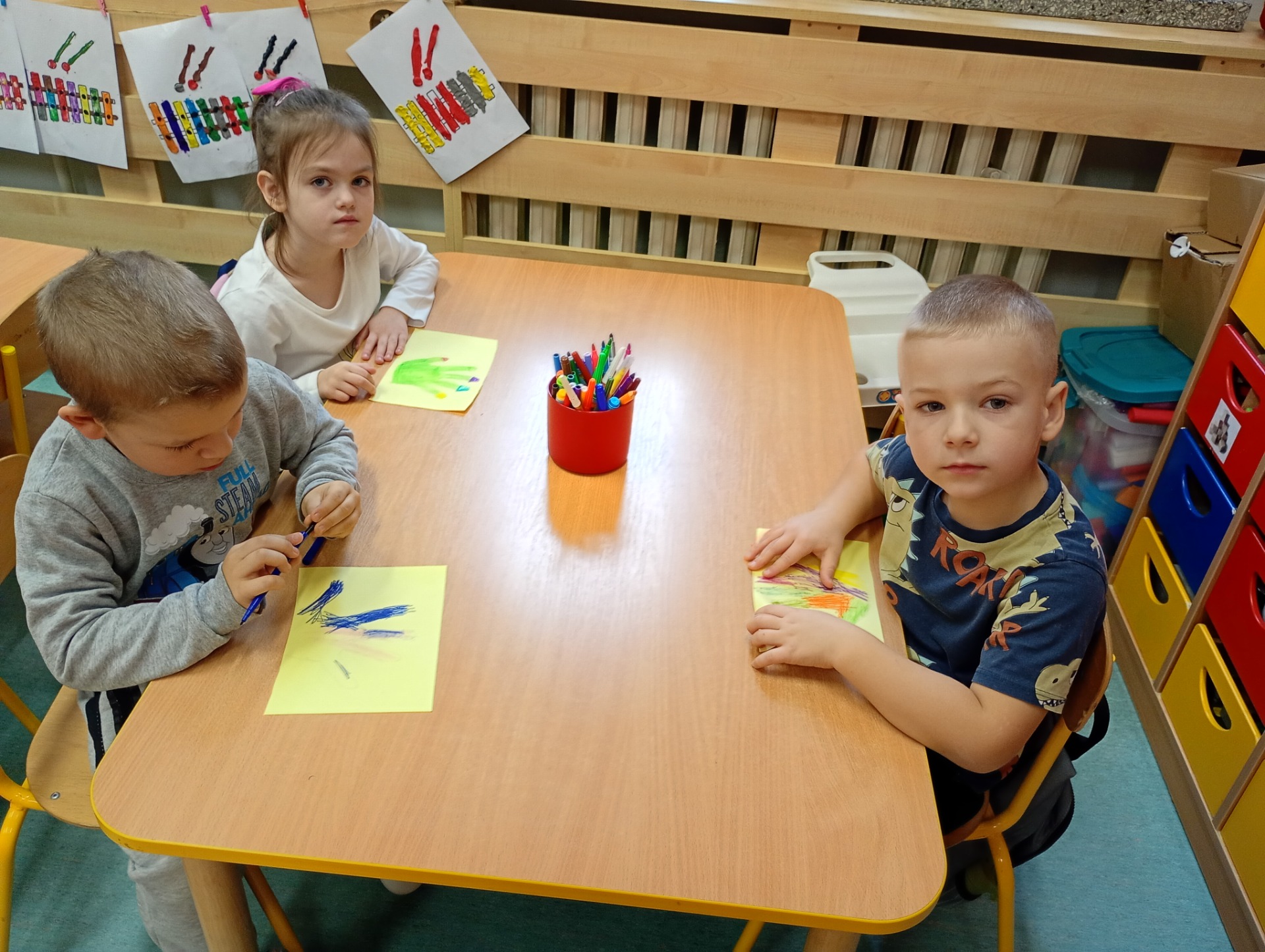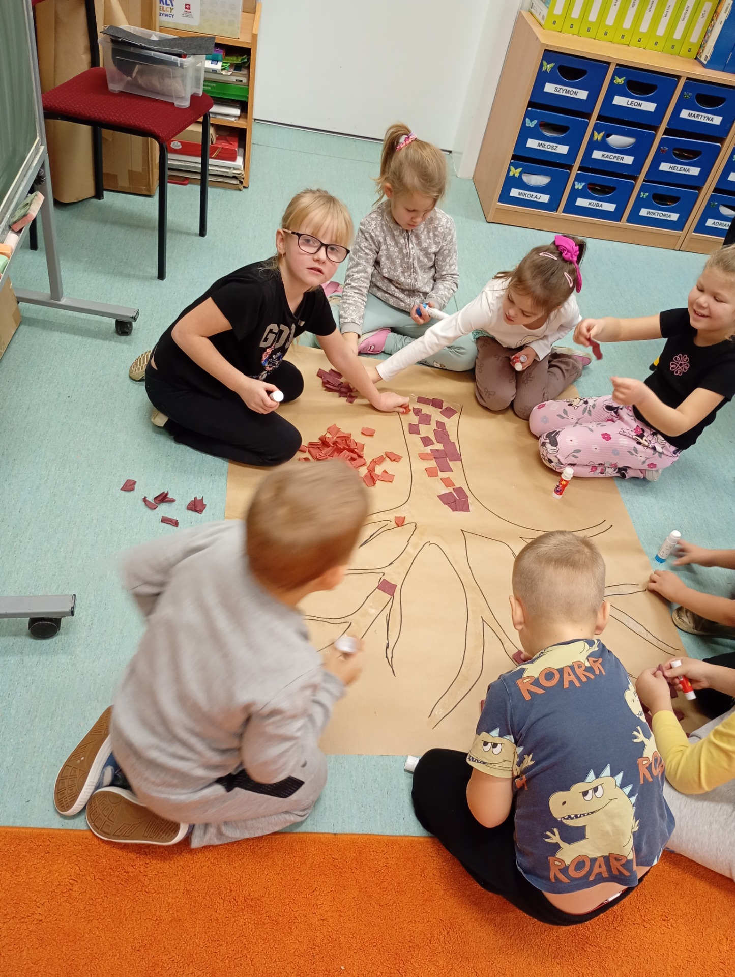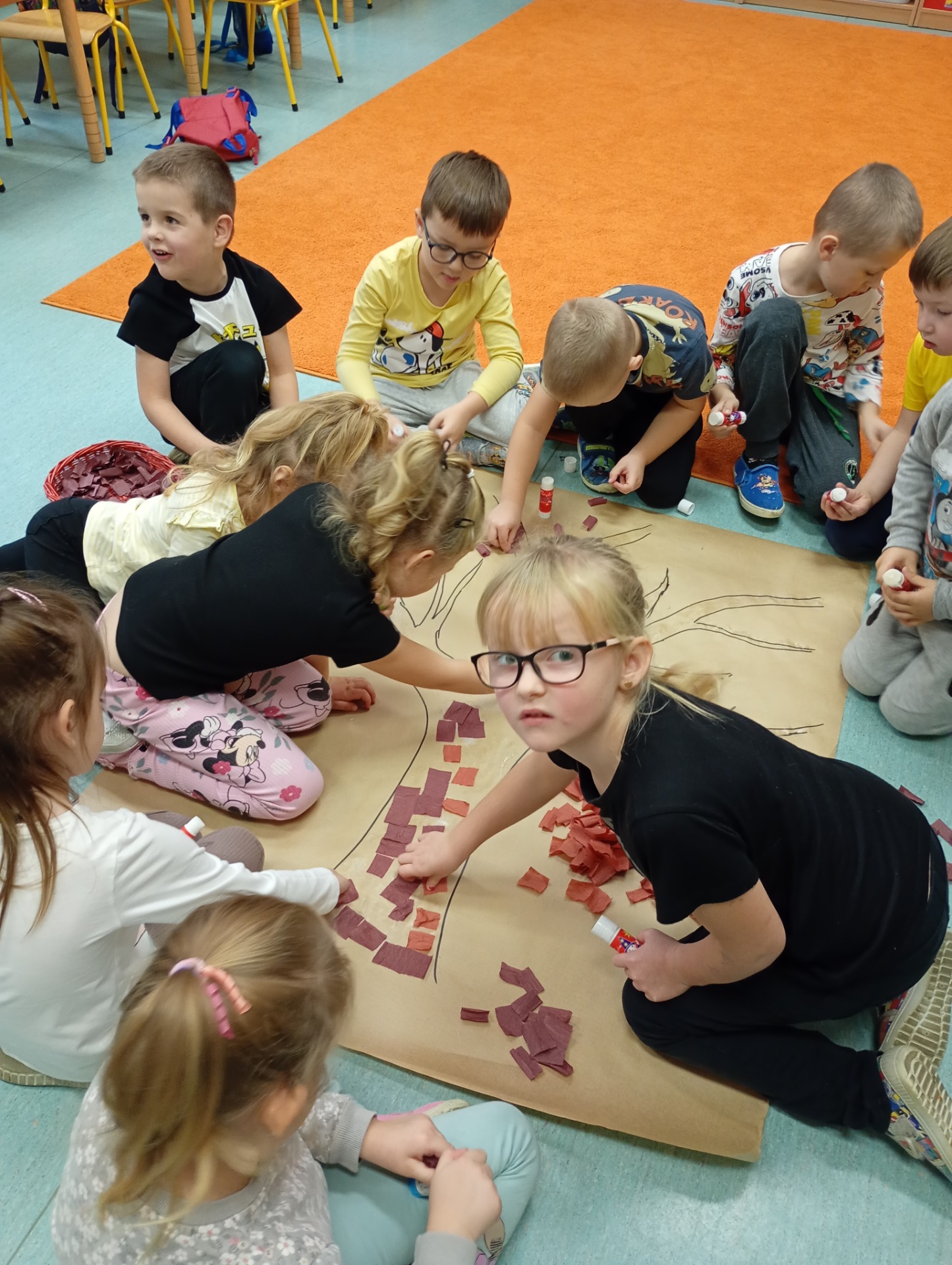 Dzieci wspólnie wykonały grupową pracę plastyczną – „Drzewo Życzliwości”. Powstała piękna praca, którą można podziwiać na przedszkolnym korytarzu.