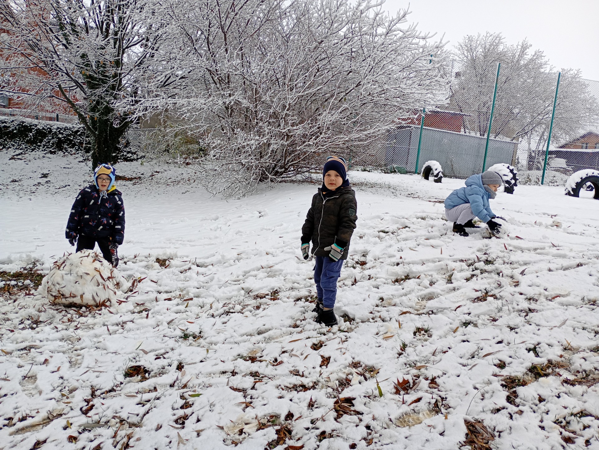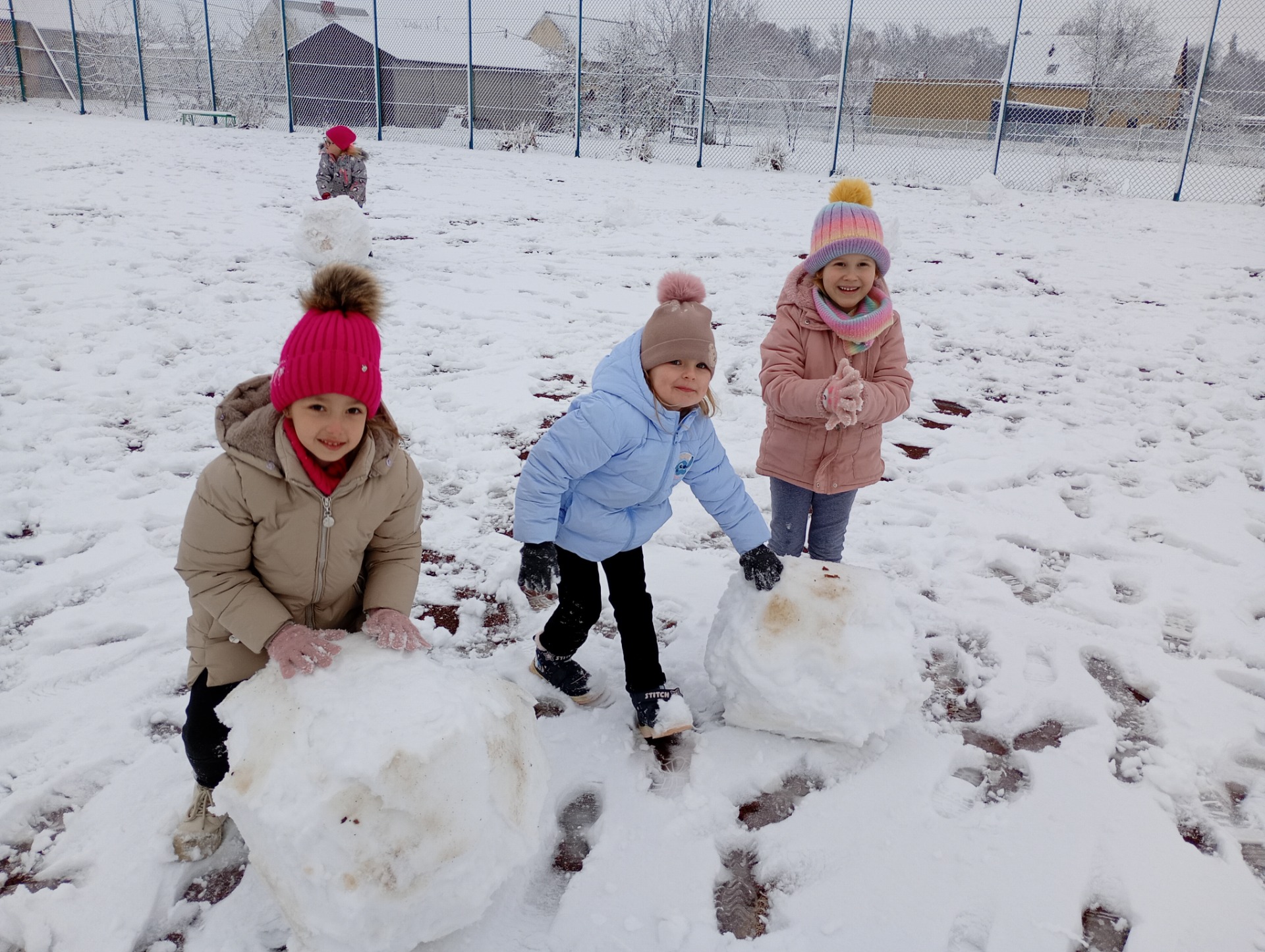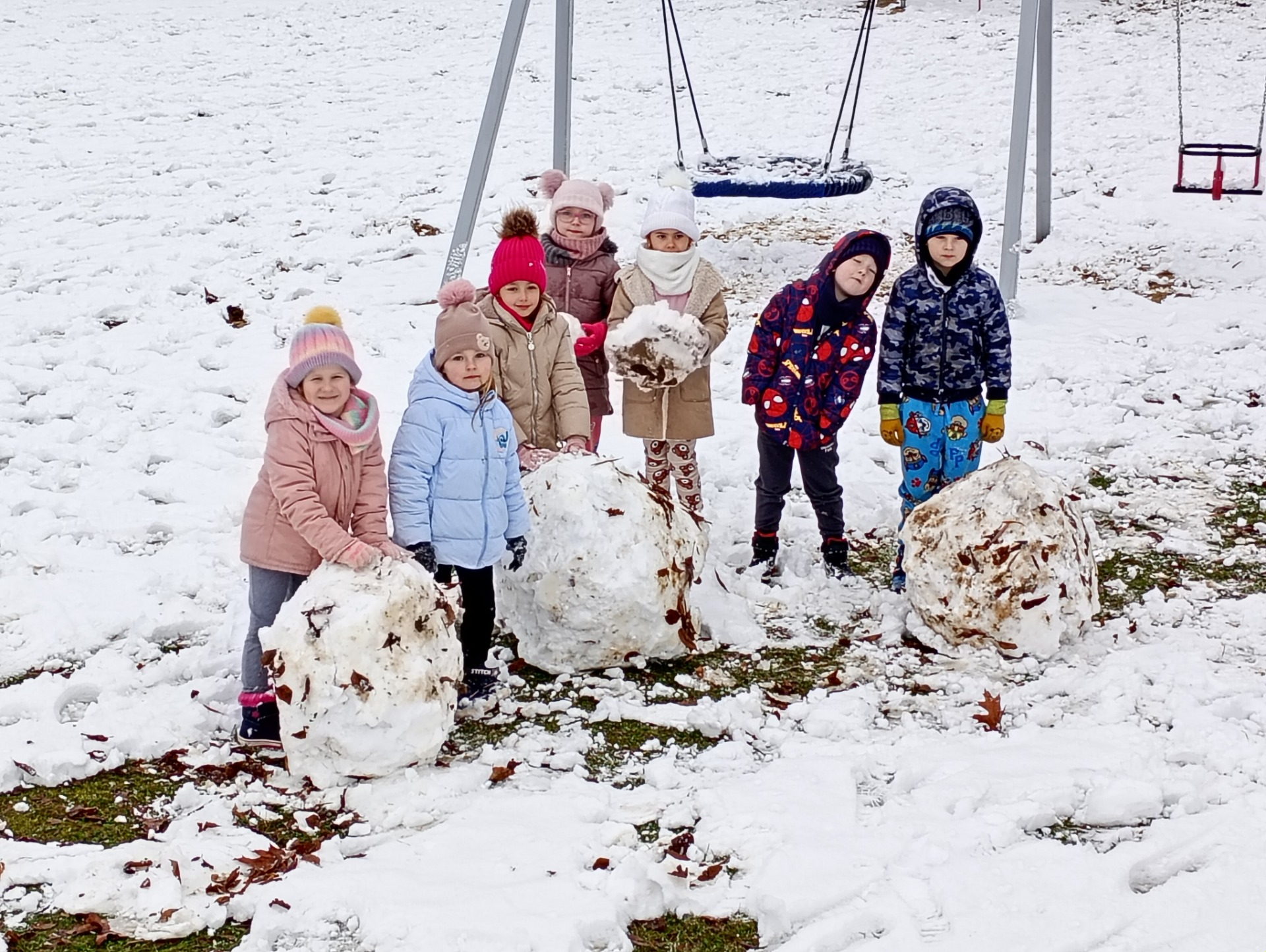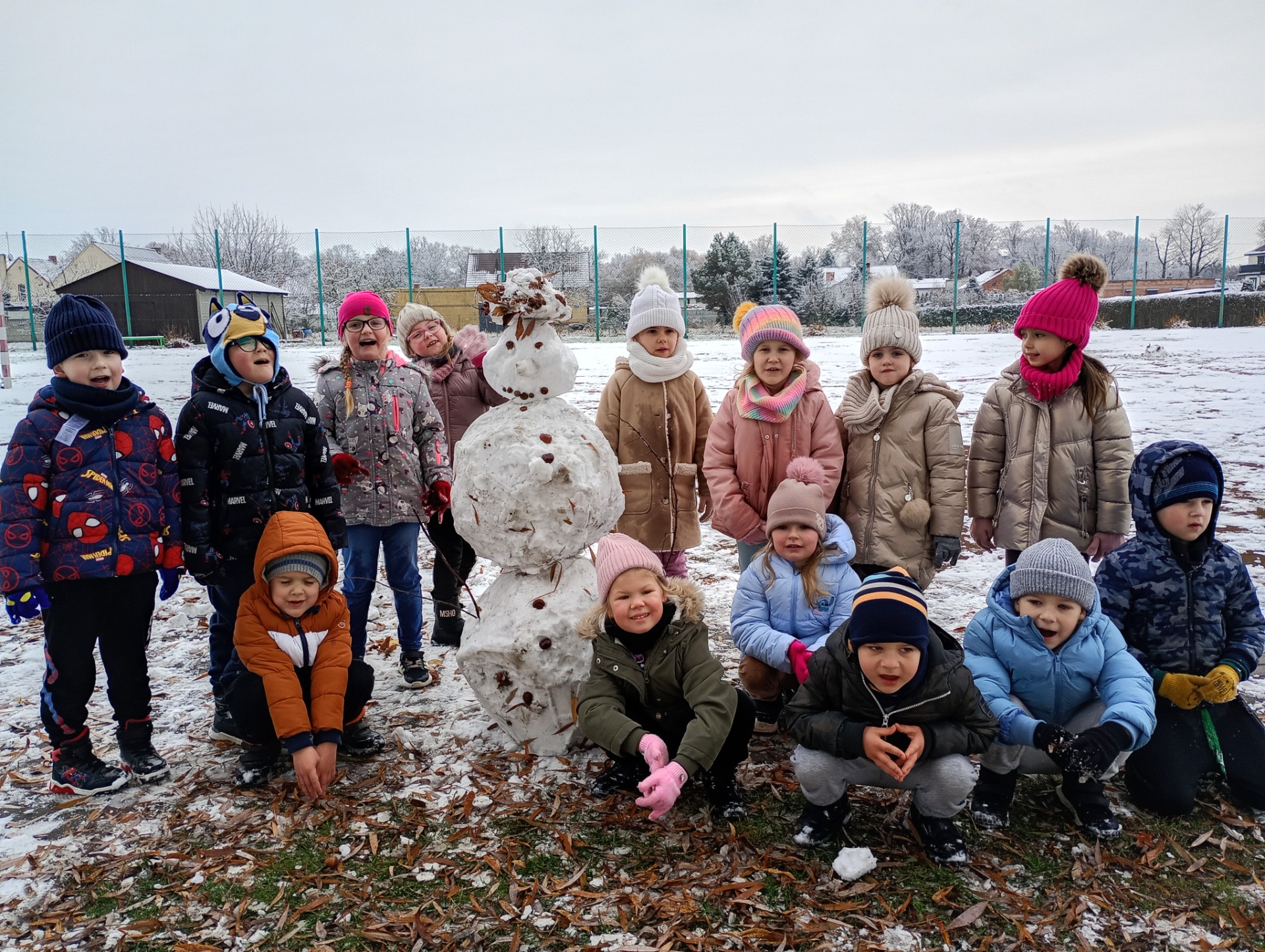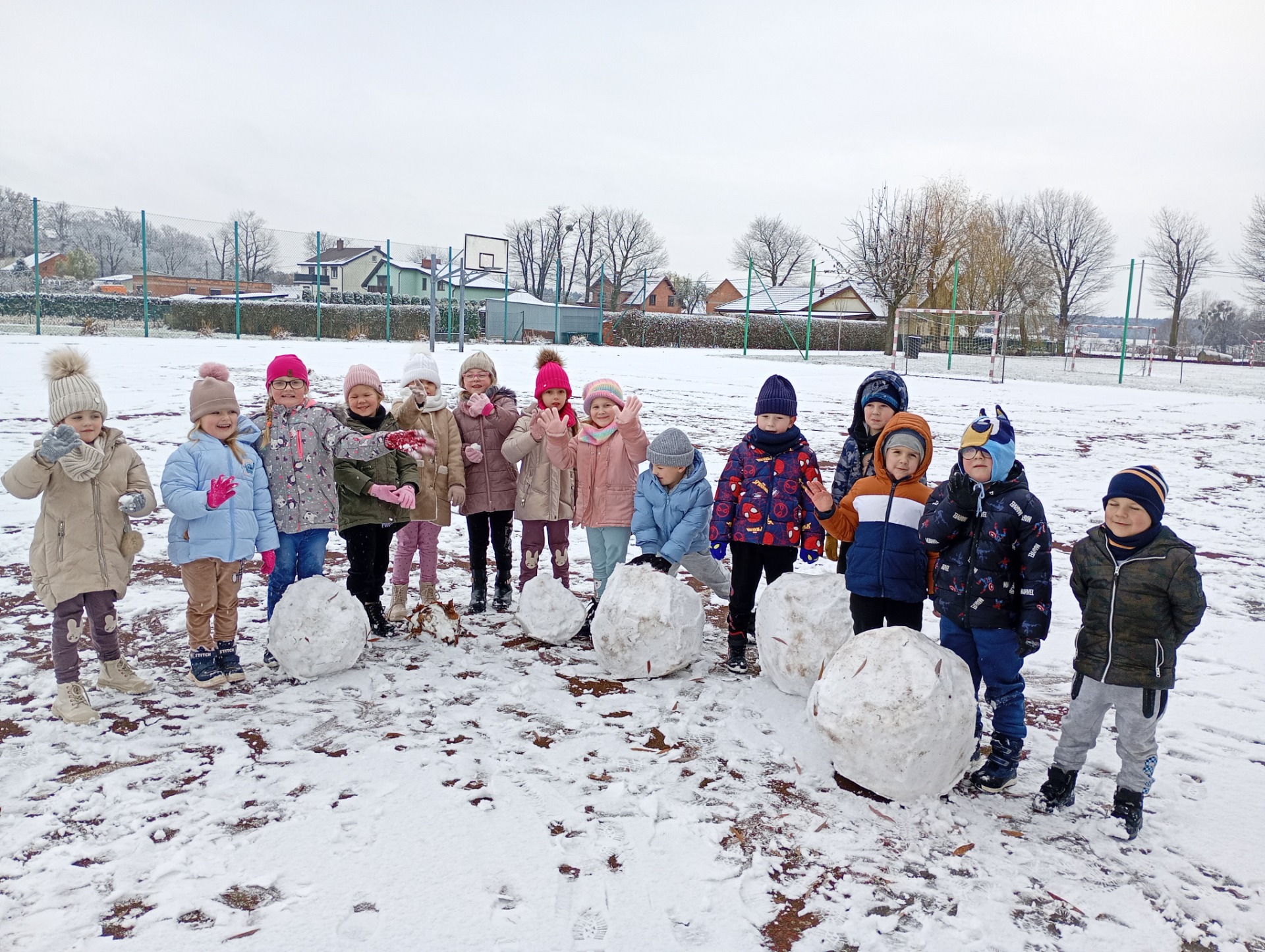 Największą atrakcją było lepienie śnieżnych kul, z których powstały wyjątkowe zimowe postacie – bałwan oraz pingwinek! Dzieci zgodnie współpracowały, toczyły śnieżne kule, dekorowały zimowych bohaterów i nie kryły radości z efektów swojej pracy.