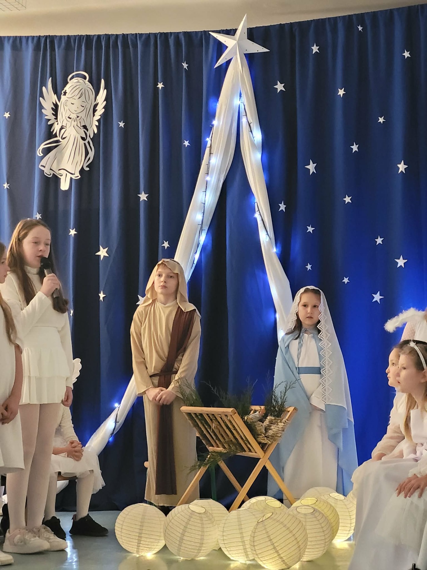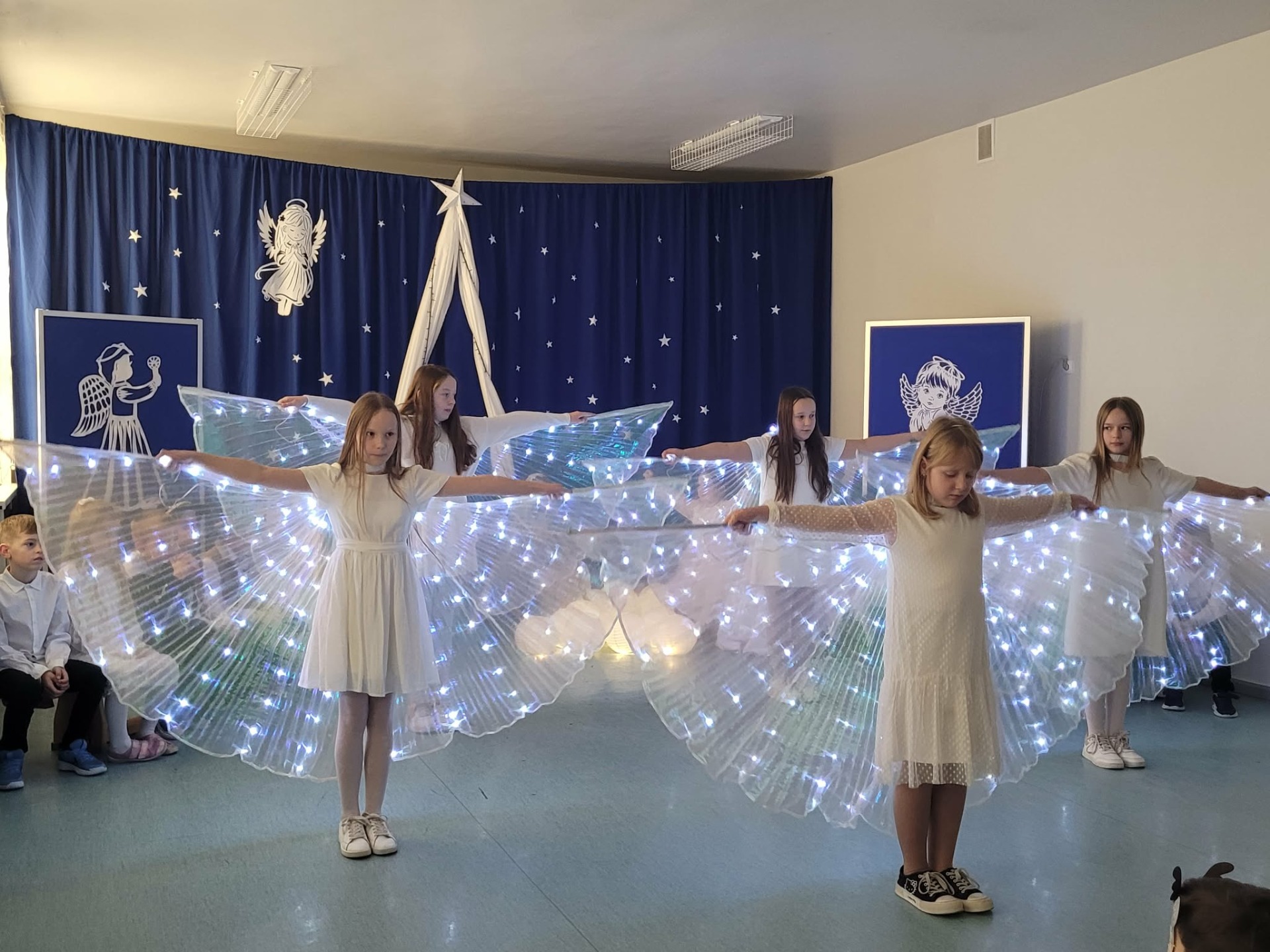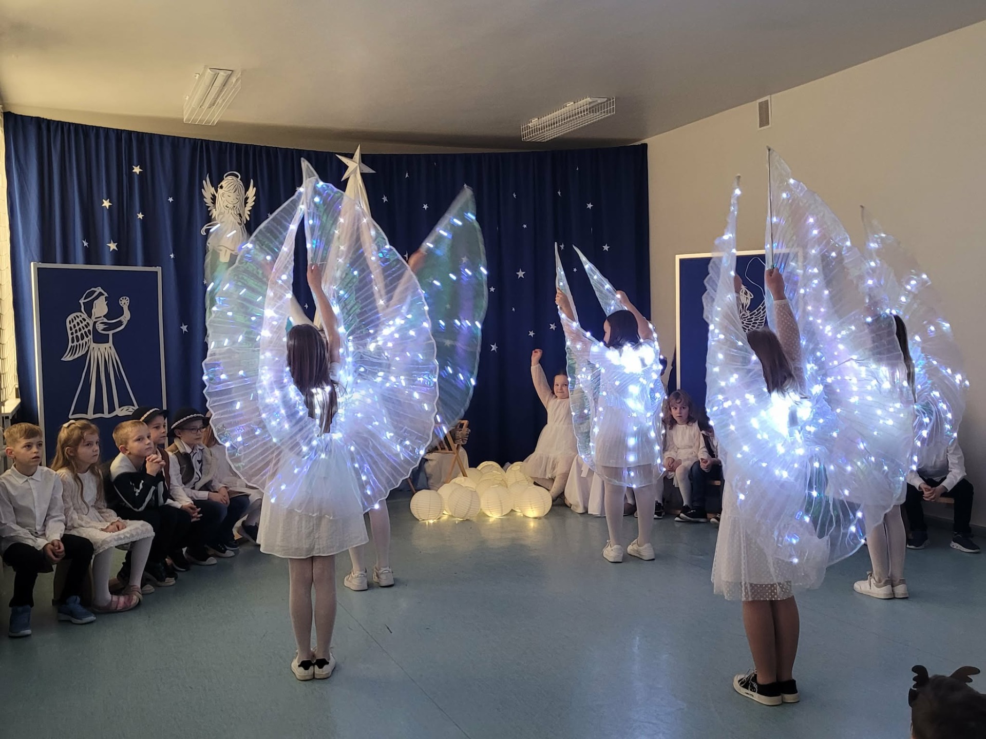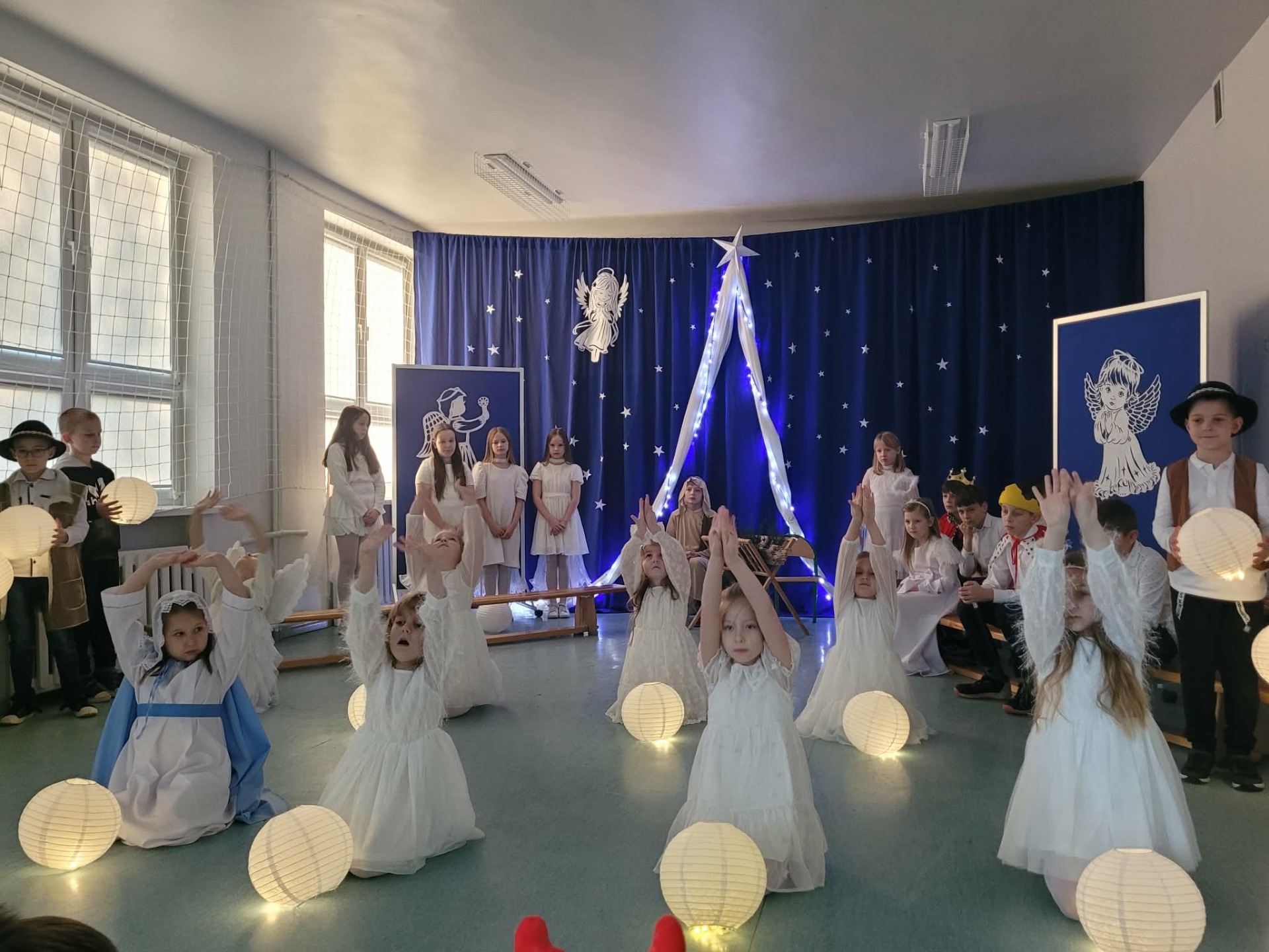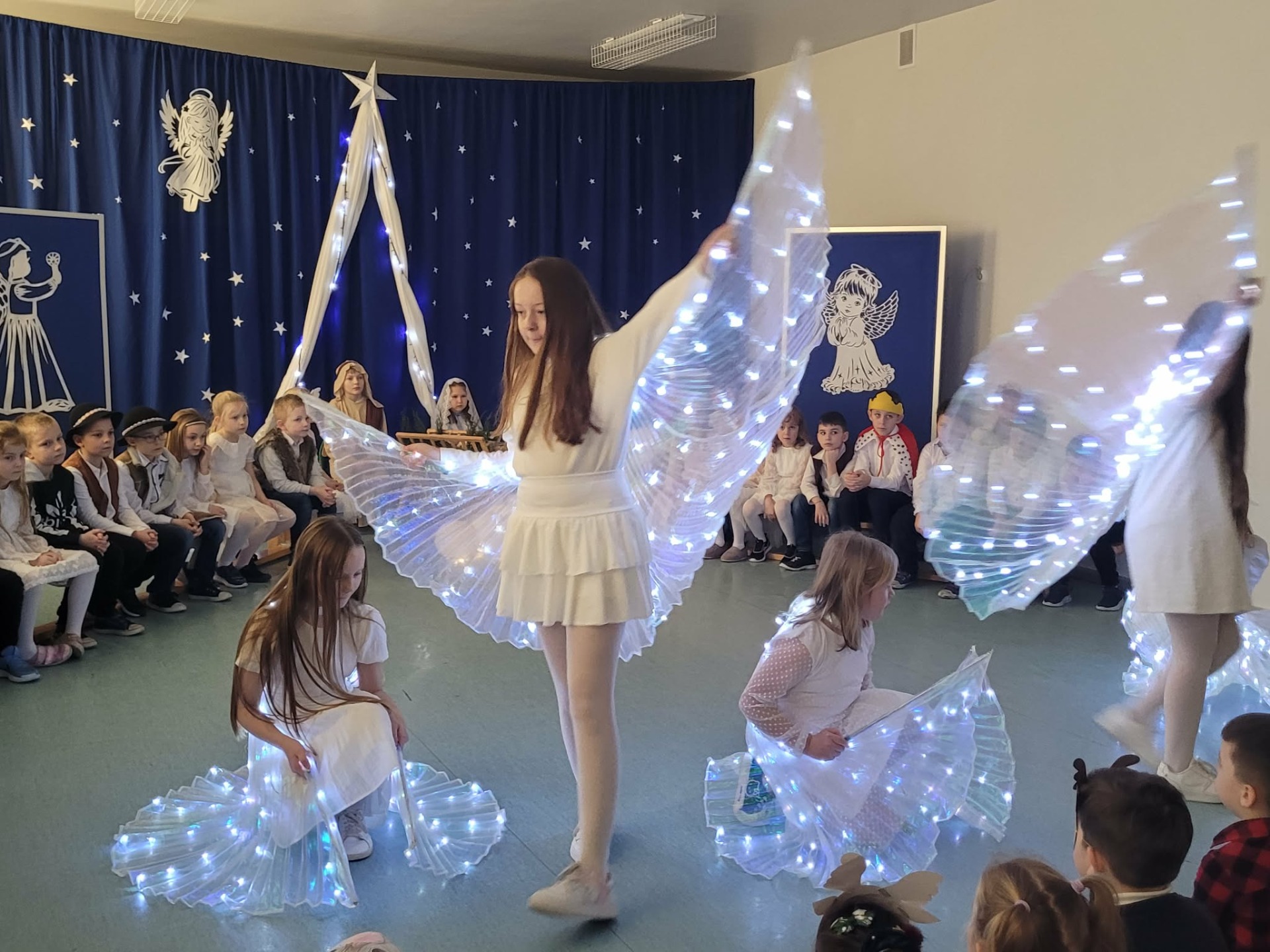 19 grudnia 2025 r. w naszej szkole odbyły się Jasełka szkolne, przygotowane przez uczniów klasy I i IV. Młodzi artyści zaprezentowali piękny program artystyczny, który wprowadził całą społeczność szkolną w świąteczny nastrój. Występ uświetniły piękne kolędy, nastrojowy taniec z lampionami oraz niezwykle efektowny taniec skrzydlatych aniołów, który zachwycił publiczność. Całość przedstawienia była pełna ciepła, radości i świątecznej magii. Serdecznie dziękujemy uczniom za zaangażowanie i trud włożony w przygotowanie tego wyjątkowego wydarzenia.